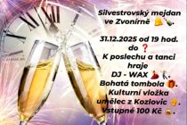 Přijďte oslavit konec roku na Silvestrovský mejdan ve Zvonírně! Akce se koná ve středu 31.12. 2025 od 19 hodin. O hudbu k tanci a poslechu se postará DJ WAX. Program zahrnuje také bohatou tombolu a speciální kulturní vložku s umělcem z Kozlovic.
