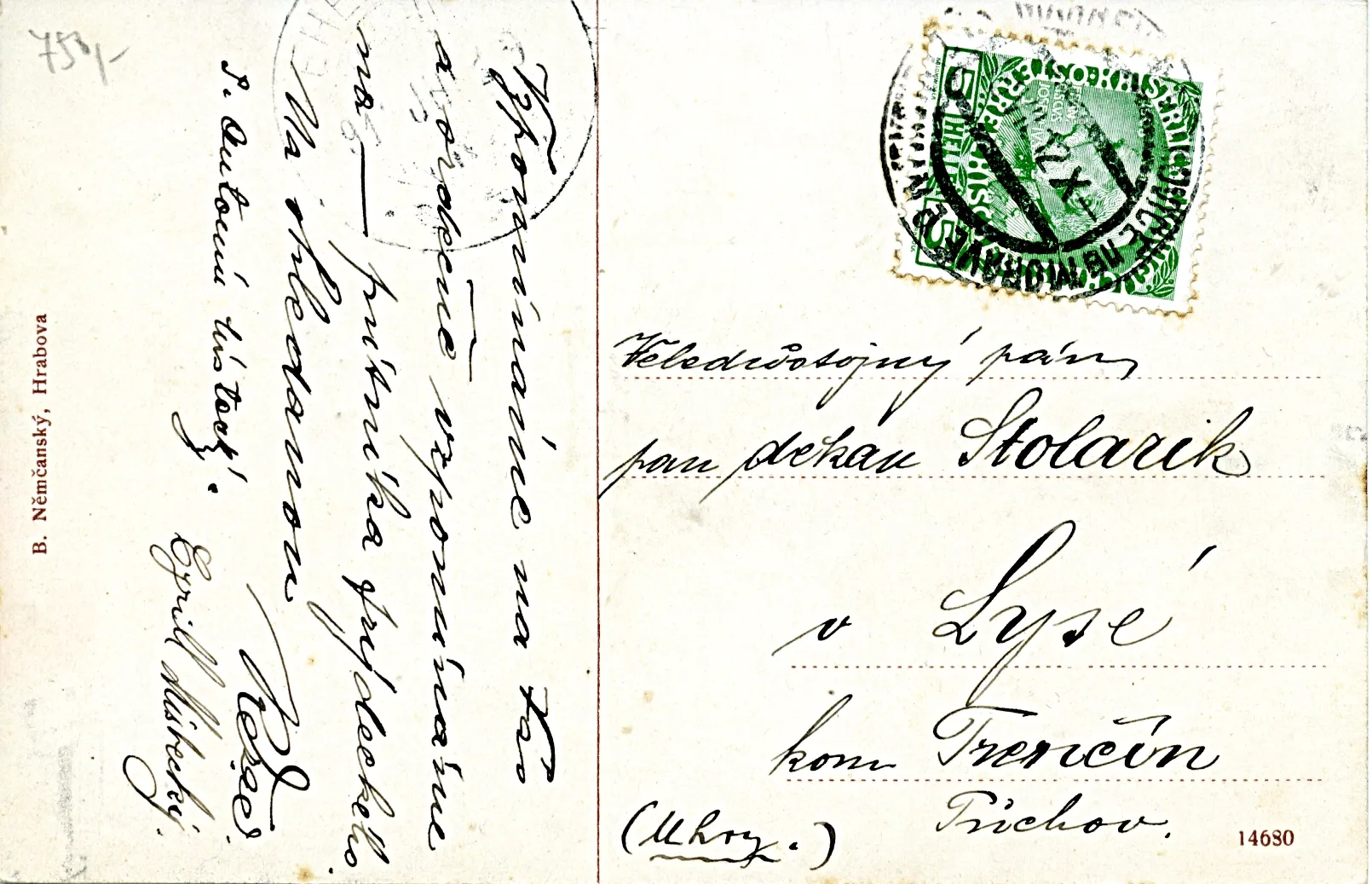 Níže vidíte pohlednici, kterou dp. Řezáč poslal krátce po své instalaci na naší farnost v roce 1912. Podepsán je i Antonín Místecký, katecheta z Valašských Klobouk, kde před svou instalací do Hrabové dp. Řezáč dlouha léta působil.