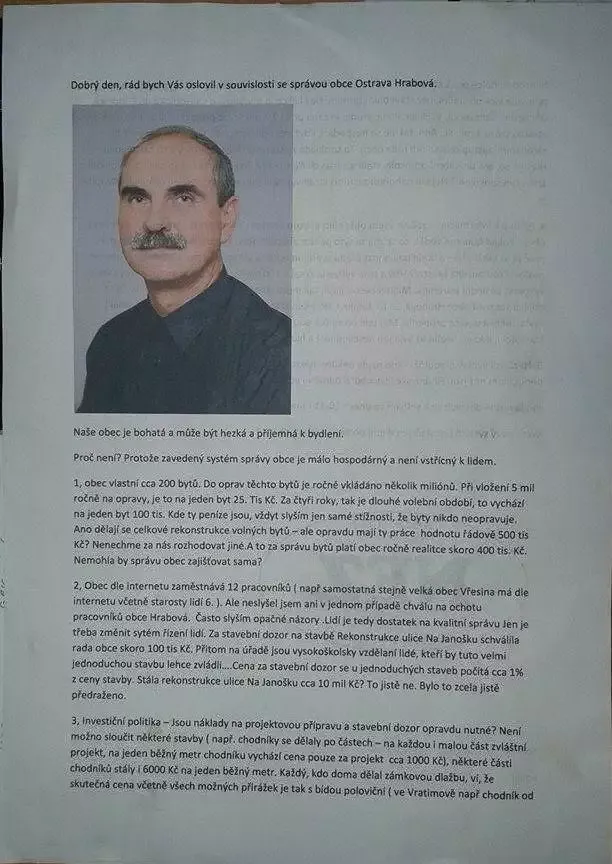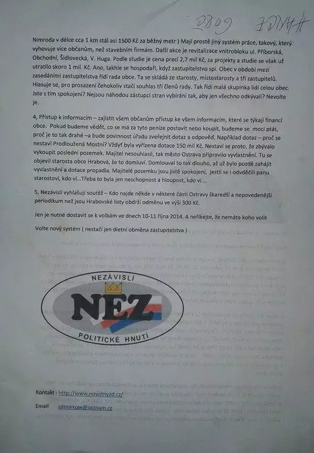 V druhém kvartále letošního roku se v Hrabové objevily letáky, které upozorňovaly na „souvislosti se správou obce Ostrava Hrabová“. Autorem je pravděpodobně Ing. Novotný a strana, která nakonec ve volbách v Hrabové nefigurovala – Nezávislí.
