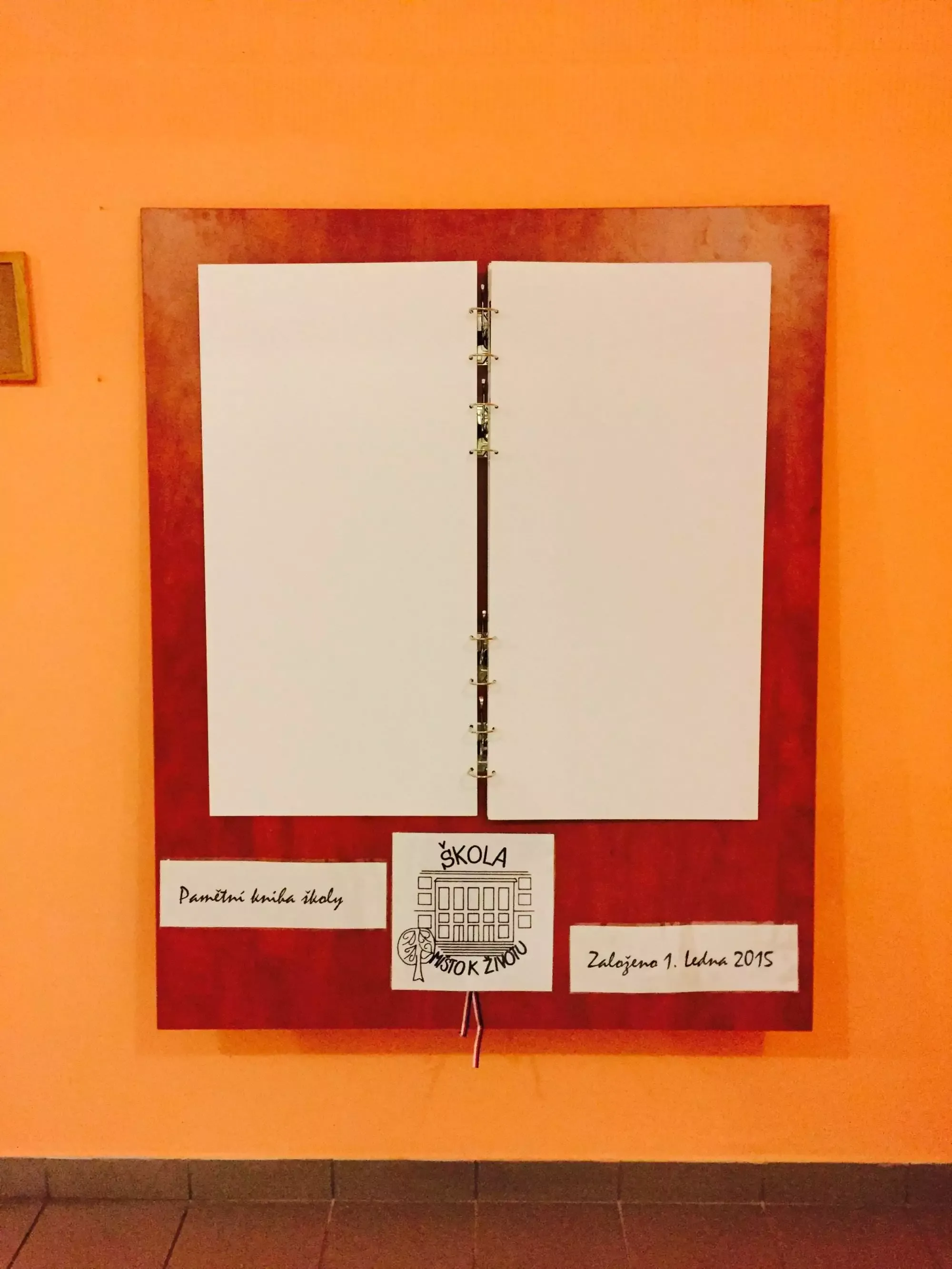 V průběhu měsíce ledna jsem si při jedné z pravidelných návštěv naší základní školy všiml, že na stěně před ředitelnou a sborovnou visí něco nového – pamětní kniha.