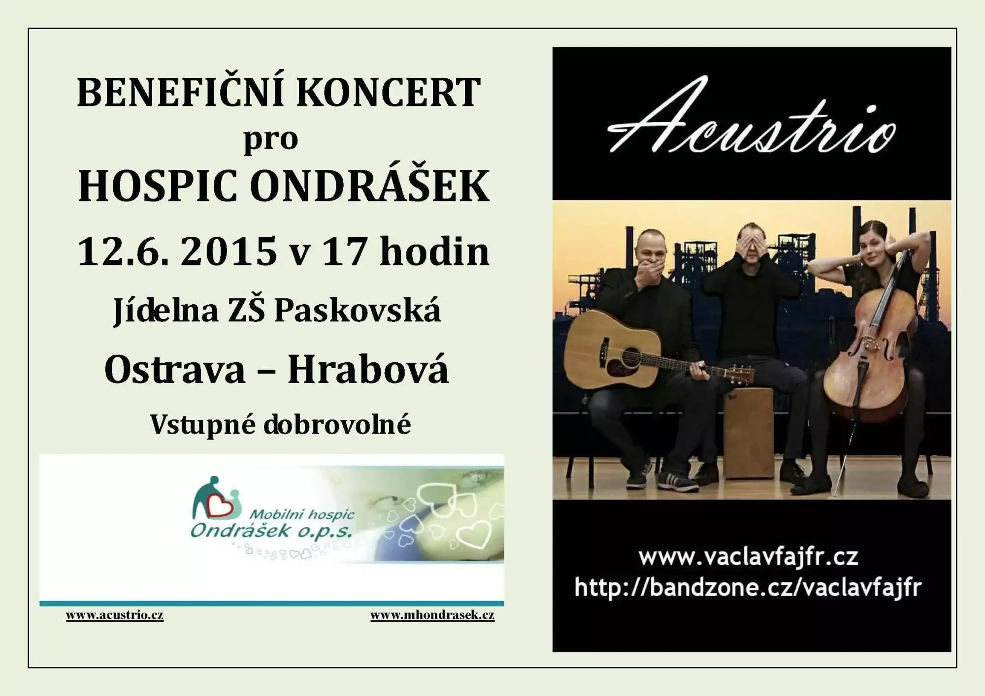 12.6. v 17. hodin se uskuteční v ZŠ Paskovská, pod záštitou starosty ÚMOb Hrabová, Benefiční koncert pro Mobilní Hospic Ondrášek, vystoupí ACUSTRIO Václava Fajfra a hosté. Výtěžek ze vstupného, které je stejně jako vloni dobrovolné, bude předán přímo na koncertě zástupcům Ondrášku. Všechny občany, kterým není lhostejný osud bohužel již nevyléčitelných pacientů, srdečně zveme.