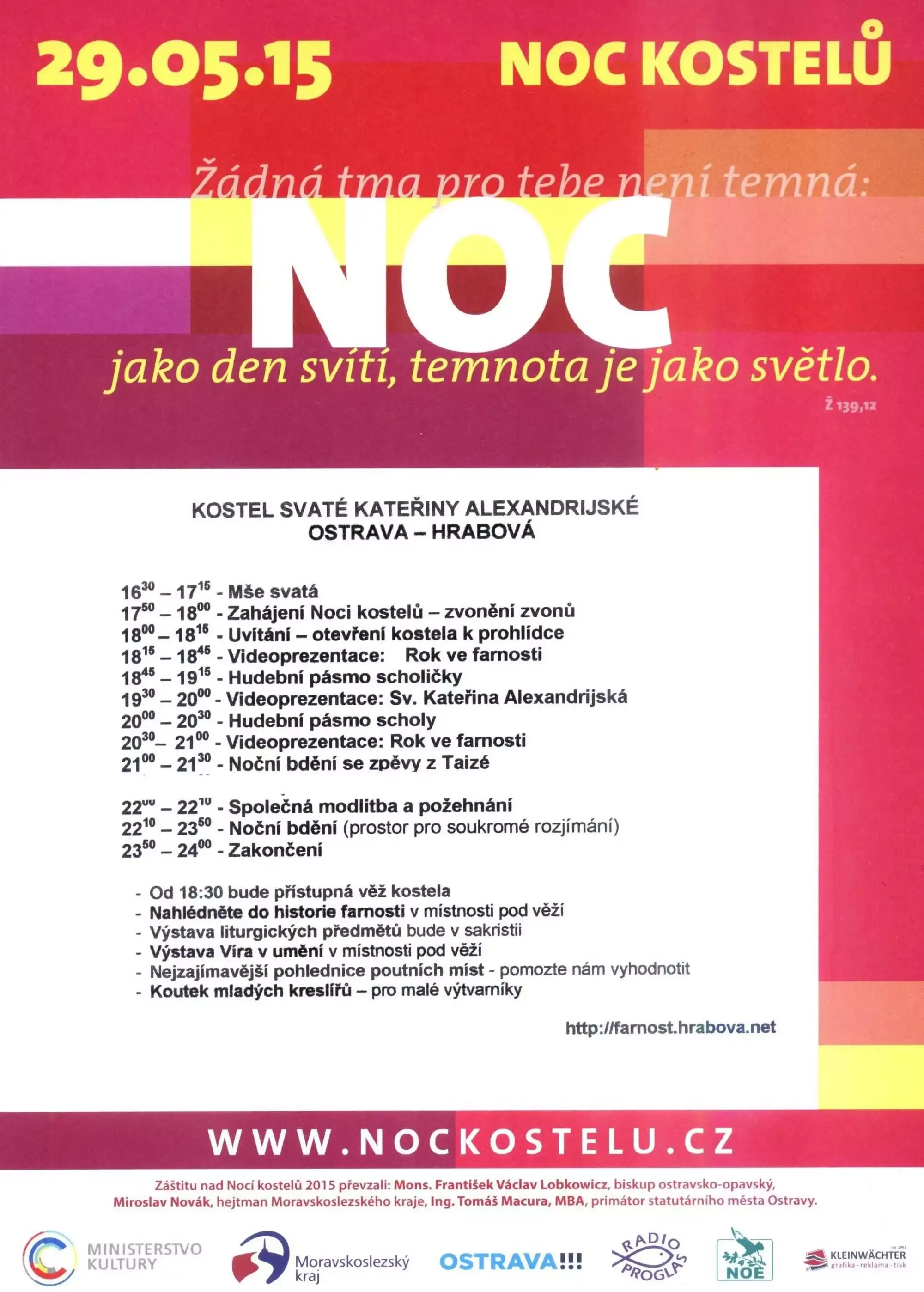 Organizátoři Noci kostelů 2015 v Hrabové zvou všechny zájemce na návštěvu kostela sv. Kateřiny Alexandrijské, který bude v rámci celostátní akce Noc kostelů 2015 otevřen široké veřejnosti dne 29. května 2015 od 18–24 hodin.