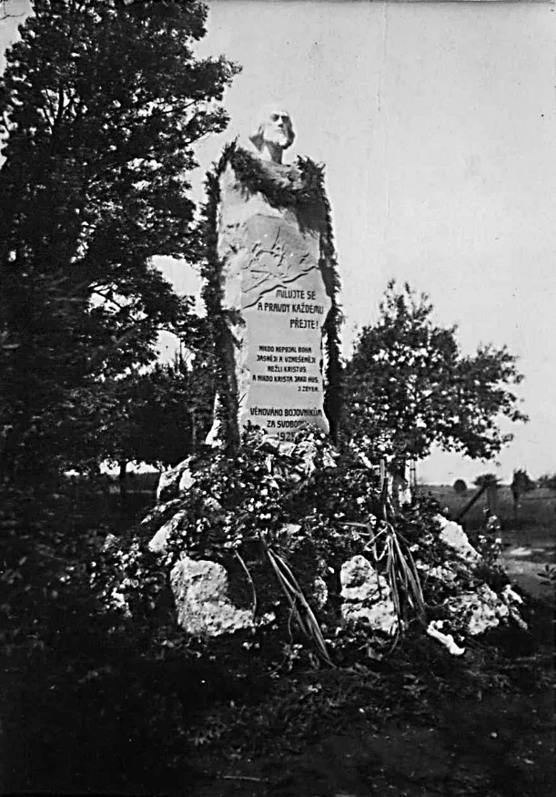 5.5.1925 svolal pan učitel Oliva osvětovou komis, aby se umluvila o objednávce pomníku a možnosti odhalení pomníku, jakož i kladení základního kamene. Sochař přivezl dva modele. První jest postava Husova na balvánu, socha sama 5550 Kč, druhý slovanský motiv se znaky republiky a reliéfem Husovým – 5300 Kč. Rozhodli se pro první. Ostatní jednání však bylo odloženo, protože týž den dostalo obecní představenstvo od státního památkového úřadu v Brně prohlášení, že nepřipustí stavbu pomníku před kostelem. Hejtmanství (dr. Boháček) odmítlo protest, že prý není obecnímu hospodářství na újmu. Na oprávněné obavy zmatků a rozbrojů, jež povstanou jistými štvanicemi před pomníkem u kostela, vůbec se nedbalo. Ba dr. B. s údivem ptal se komunistů a agrárníků: „I vy jste proti pomníku Husovu?“