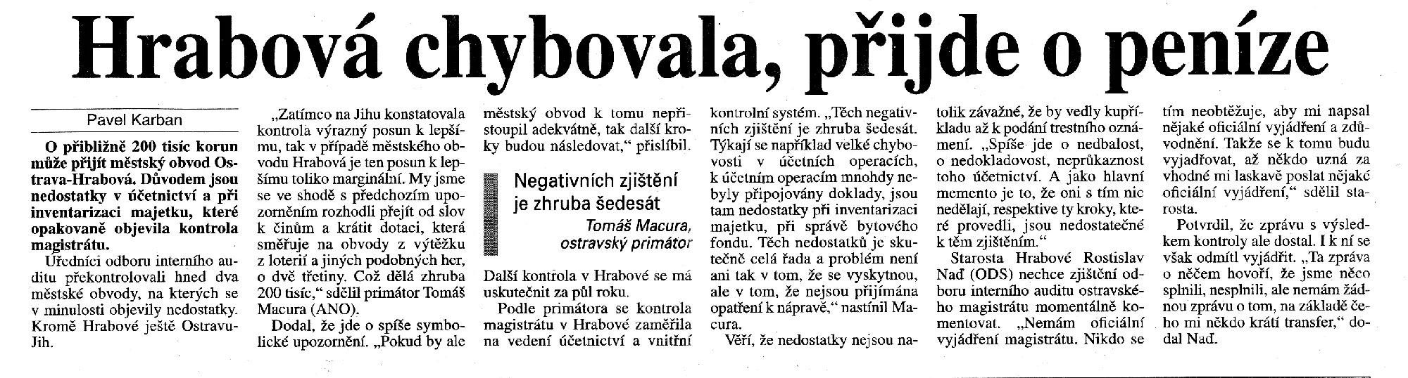 Mimo jiné to bude mít na Hrabovou i finanční dopady.Vydržte do příštího týdne-od vedení radnice se tuto informaci asi tak rychle nedovíte.Můžete si podle zákona 106 tuto zprávu o provedeném auditu z města vyžádat na radnici…
