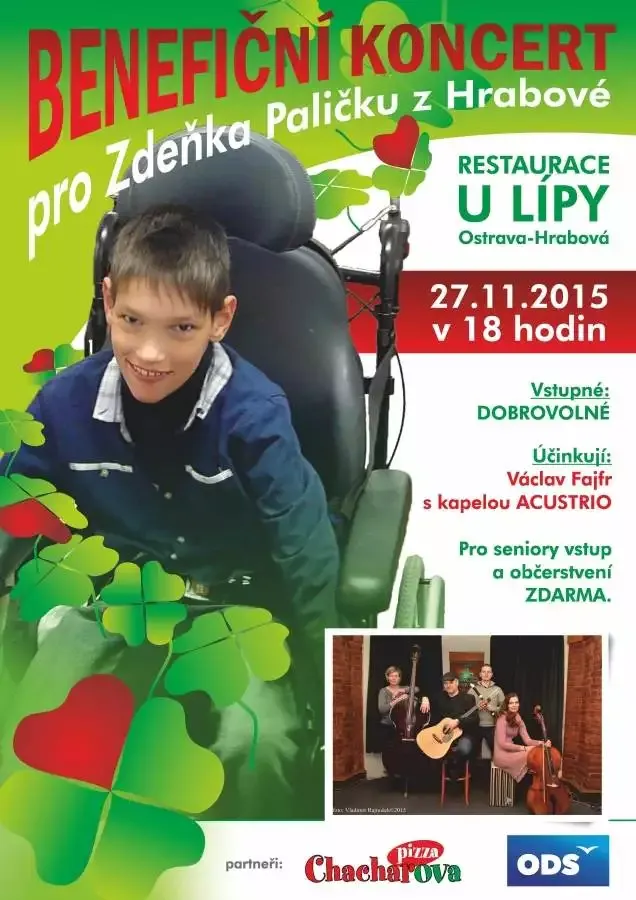 Dne 27.11.2015 se od 18. hod. koná v restauraci „U Lípy“ benefiční koncert pro Zdeňka Paličku z Hrabové. Účinkujícím je Václav Fajfr se svou kapelou Acustrio.Přijďte podpořit dobrou věc formou dobrovolného vstupného. Pro seniory je zajištěno občerstvení a vstup zdarma.