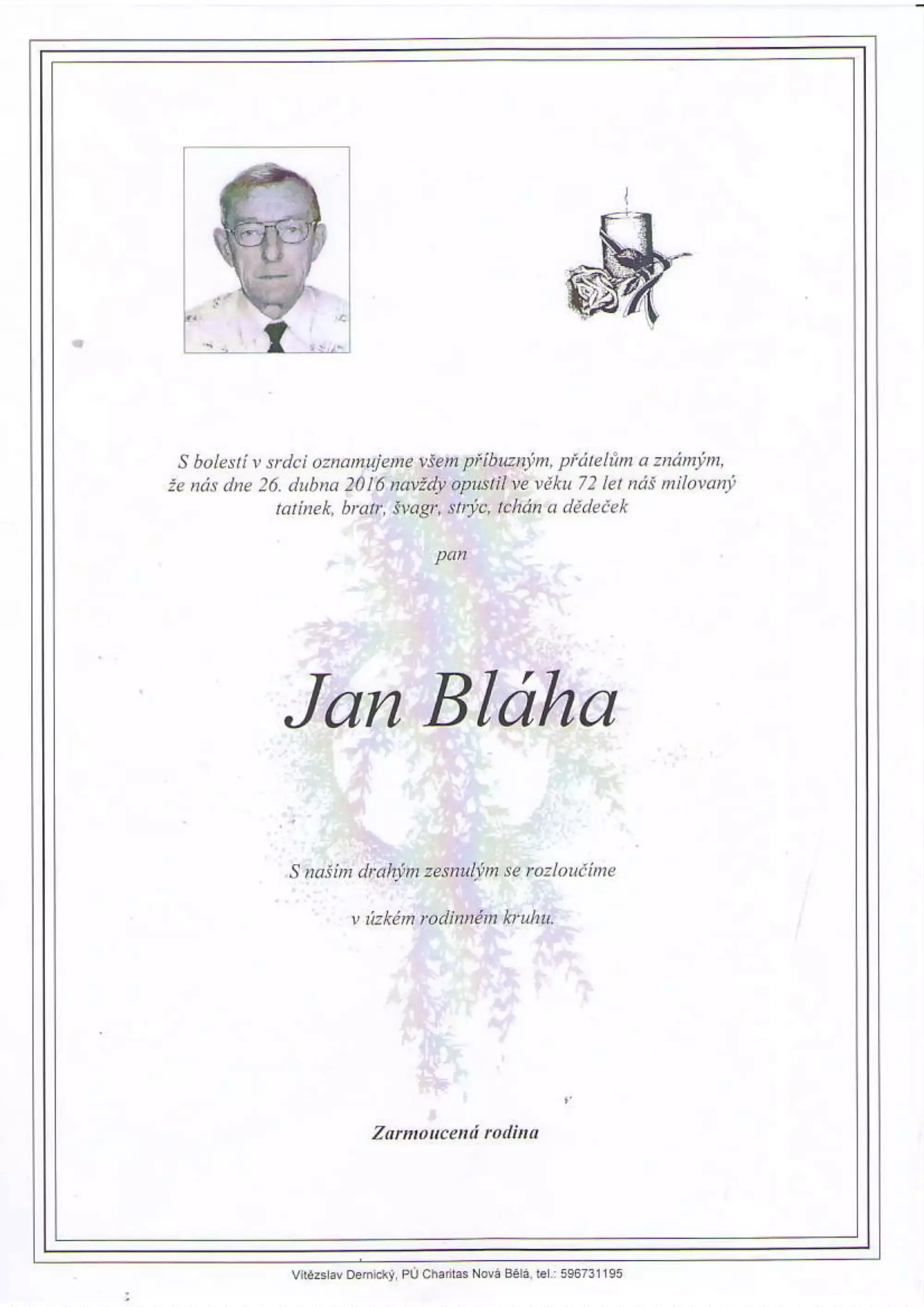 S bolestĂ v srdci oznamujeme všem pĹ™ĂbuznĂ˝m, přátelĹŻm a známĂ˝m, Ĺľe nás dne 26. dubna 2016 navĹľdy opustil ve vÄ›ku 72 let náš milovanĂ˝ tatĂnek, bratr, švagr, strĂ˝c, tchán a dÄ›deÄŤek pan Jan Bláha.