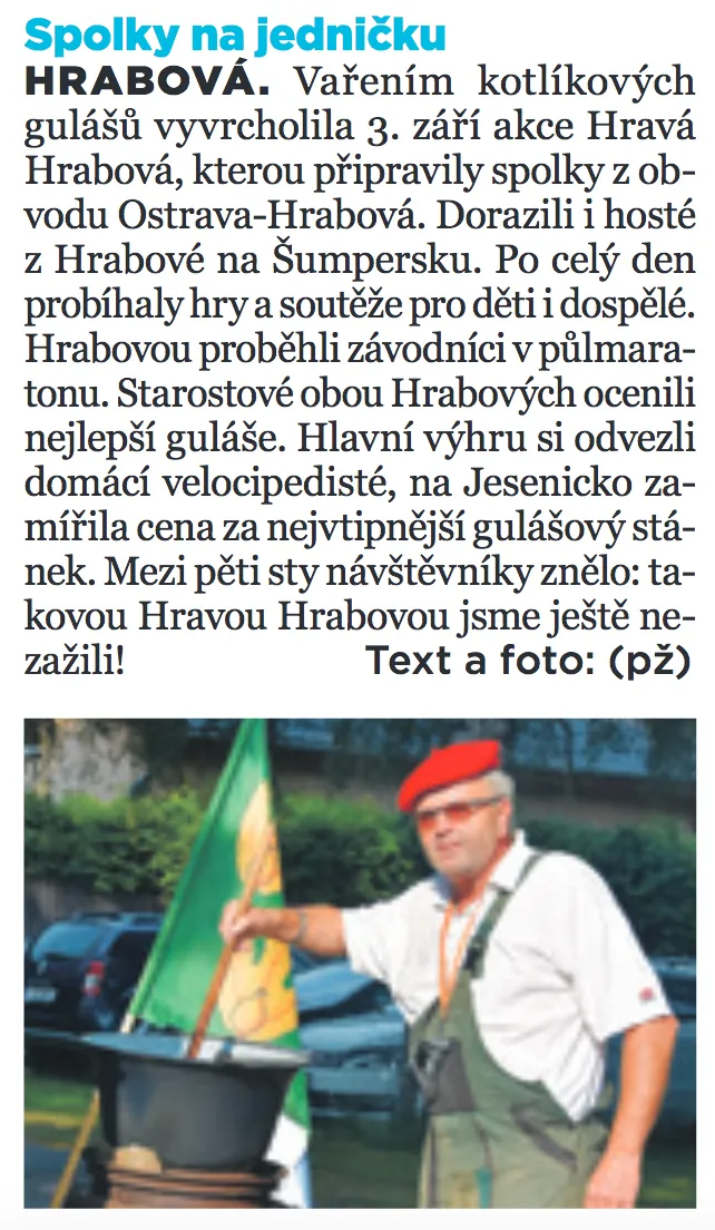 HRABOVÁ. Vařením kotlíkových gulášů vyvrcholila 3. září akce Hravá Hrabová, kterou připravily spolky z obvodu Ostrava-Hrabová. Dorazili i hosté z Hrabové na Šumpersku. Po celý den probíhaly hry a soutěže pro děti i dospělé. Hrabovou proběhli závodníci v půlmaratonu. Starostové obou Hrabových ocenili nejlepší guláše. Hlavní výhru si odvezli domácí velocipedisté, na Jesenicko zamířila cena za nejvtipnější gulášový stánek. Mezi pěti sty návštěvníky znělo: takovou Hravou Hrabovou jsme ještě nezažili!