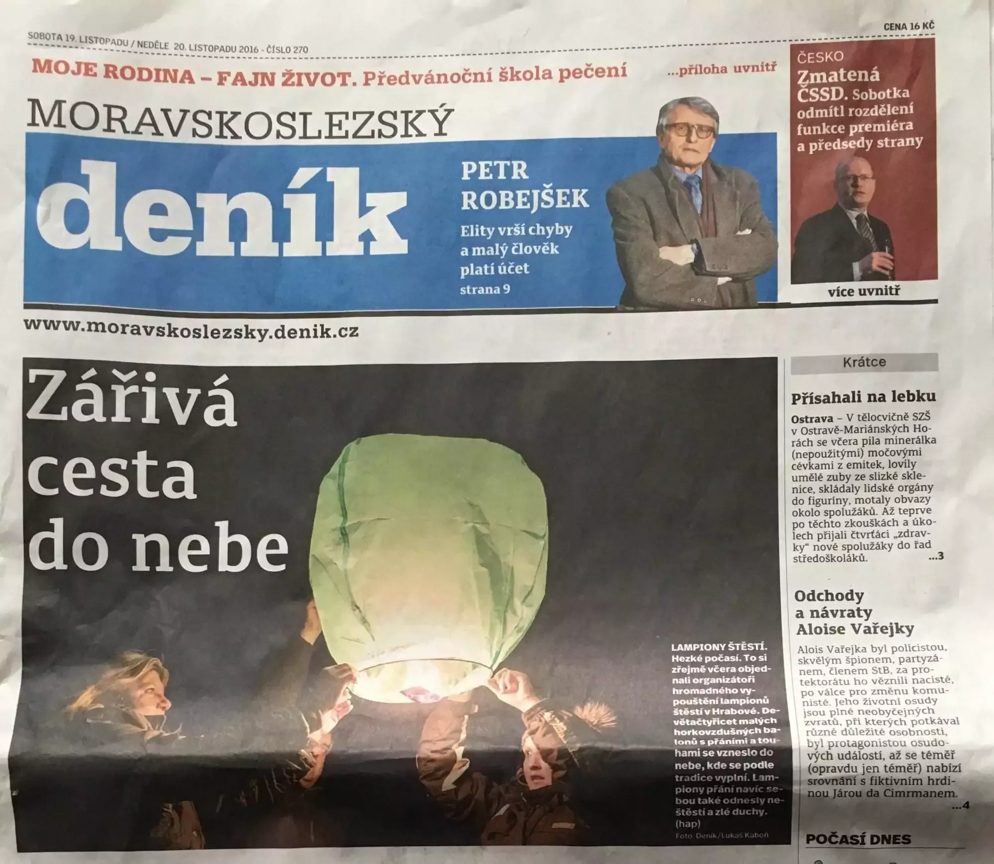 „Zářivá cesta do nebe“, tak pojmenovali naši akci na titulní straně víkendového vydání Moravskoslezského deníku. Hrabová se tak opět dostala do podvědomí čtenářů v našem regionu. Děkujeme těmto novinám i za upoutávku, kterou zveřejnili před akcí.
