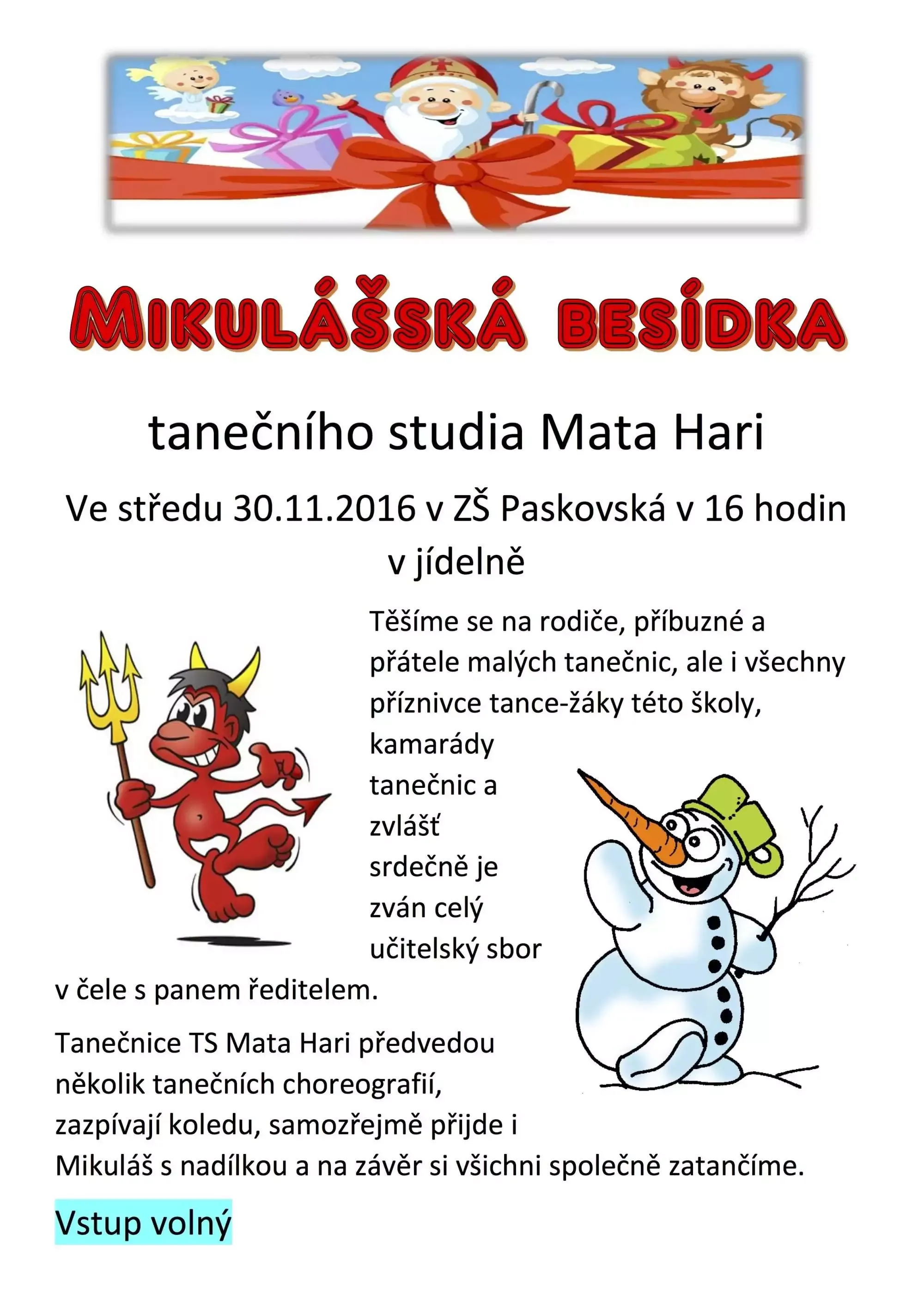 Mikulášská besídka tanečního studia Mata Hari se uskuteční ve středu 30.11.2016 v ZŠ Paskovská v 16 hodin v jídelně.