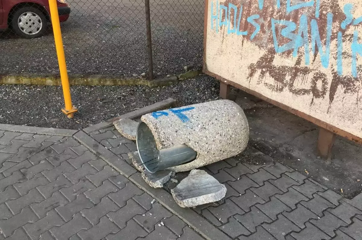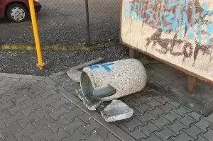 Zničený odpadkový koš na zastávce Mostní ve směru na Šídlovec.