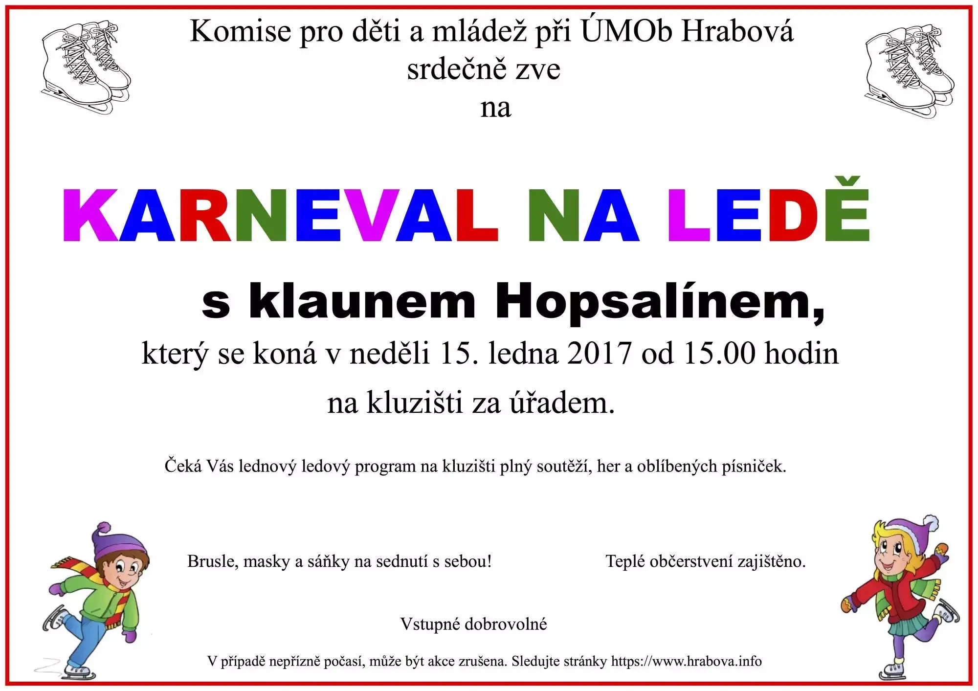 Komise pro děti a mládež při ÚMOb Hrabová srdečně zve na KARNEVAL NA LEDĚ s klaunem Hopsalínem, který se koná v neděli 15. ledna 2017 od 15.00 hodin na kluzišti za úřadem.