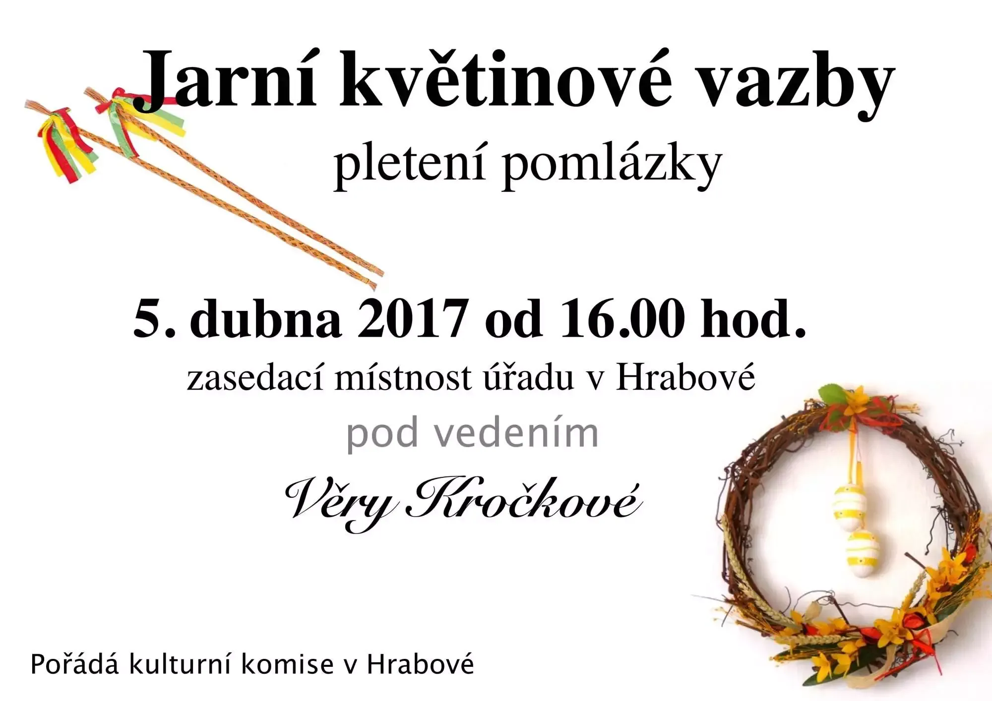 Kulturní komise vás zve na seminář Jarní květinové vazby – pletení pomlázky, který povede zkušená floristka Věrka Kročková.