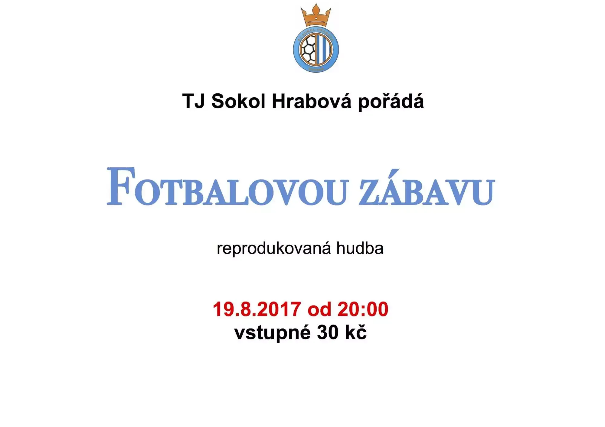 TJ Sokol Hrabová pořádá dne 19.8.2017 od 20:00 hod. fotbalovou zábavu s reprodukovanou hudbou. Vstupné 30 Kč.