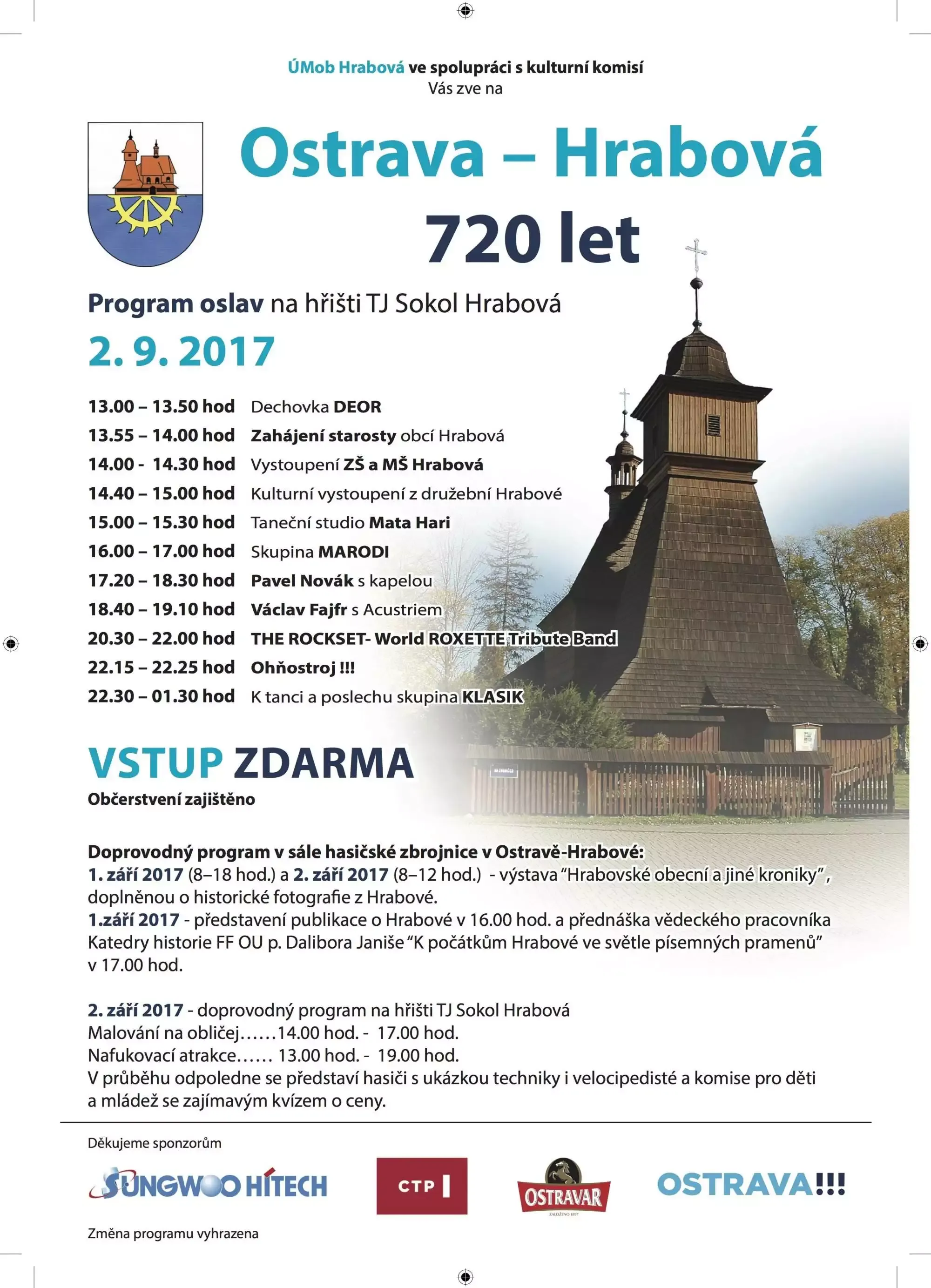 - 1. září 2017 – představení publikace o Hrabové v 16.00 hod. a přednáška vědeckého pracovníka Katedry historie FF OU p. Dalibora Janiše “K počátkům Hrabové ve světle písemných pramenů” v 17.00 hod.