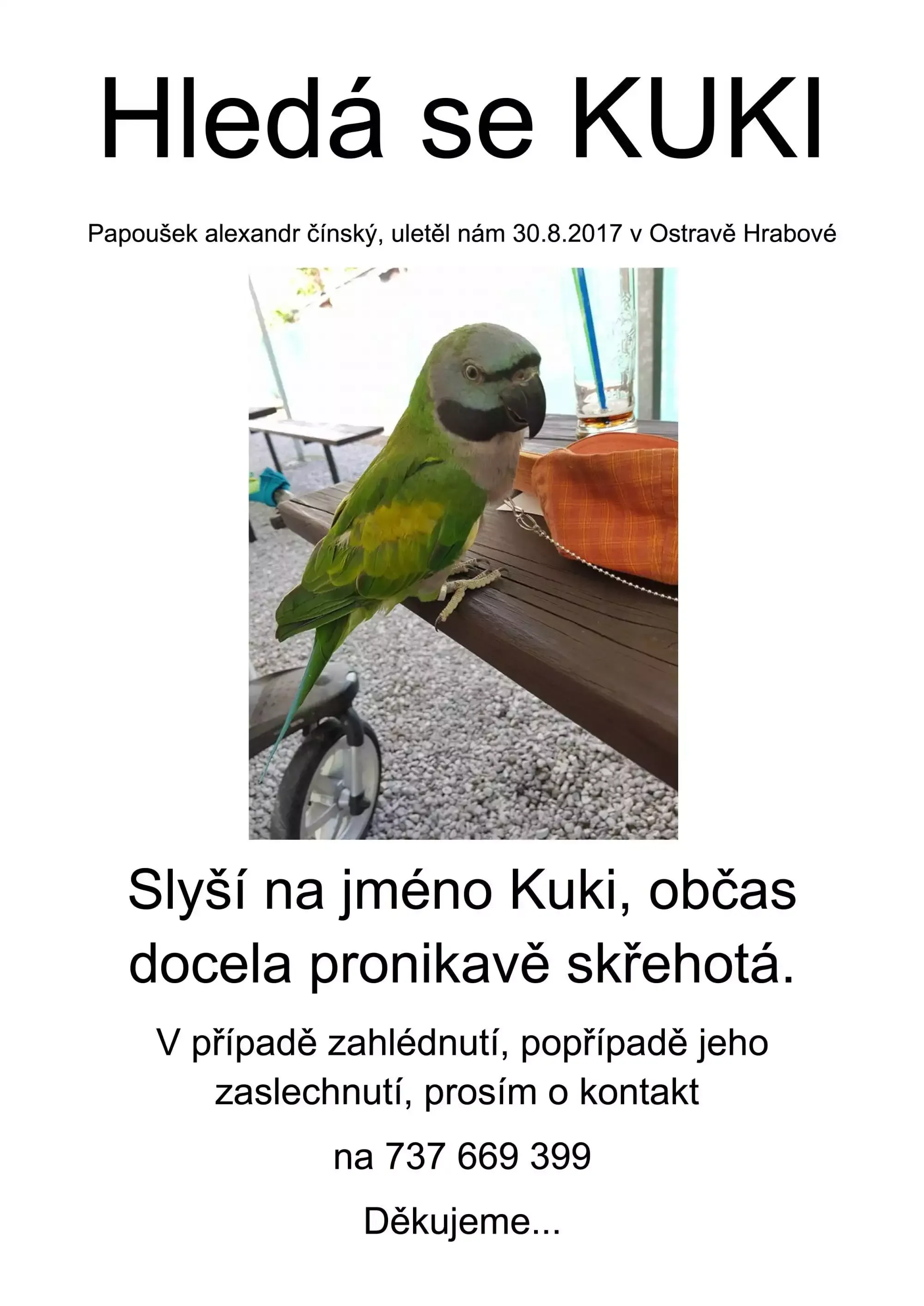 Papoušek alexandr čínský nám uletěl dne 30.8.2017 v Ostravě-Hrabové. Slyší na jméno Kuki, občas docela pronikavě skřehotá.