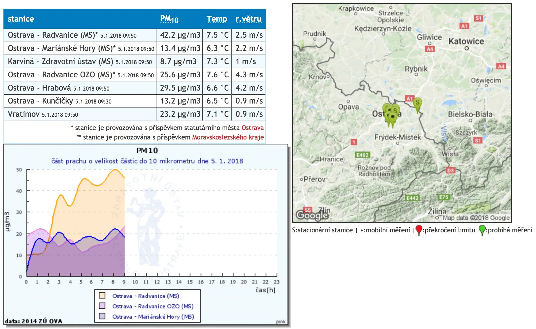Aktuální informace (PM10, teplota, síla větru) včetně grafů jsou prezentovány online na stránkách zdravotního ústavu.
