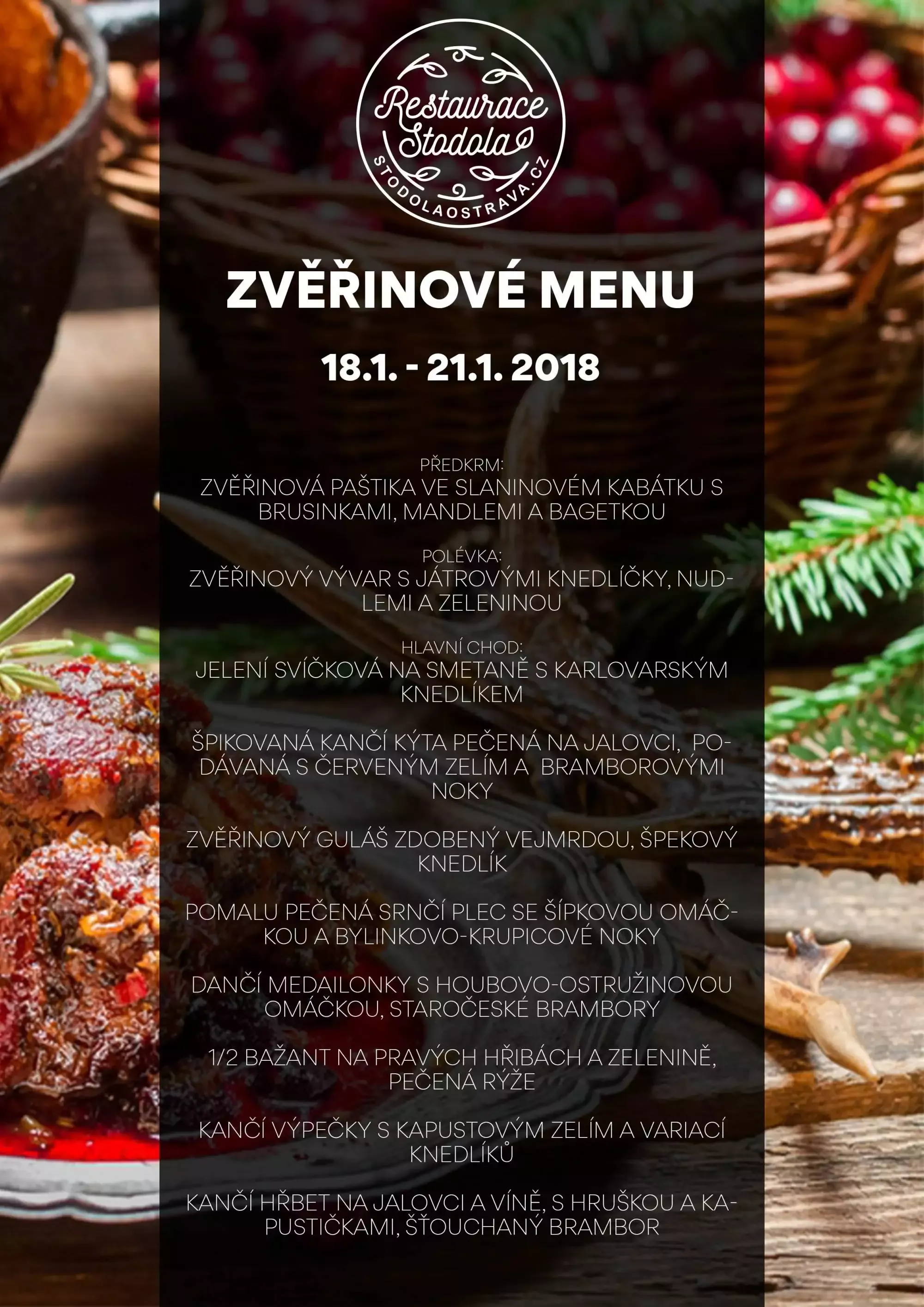 Restaurace Stodola Vás zve na zvěřinové menu, které bude v nabídce od čtvrtku 18.1. do neděle 21.1. 2018
