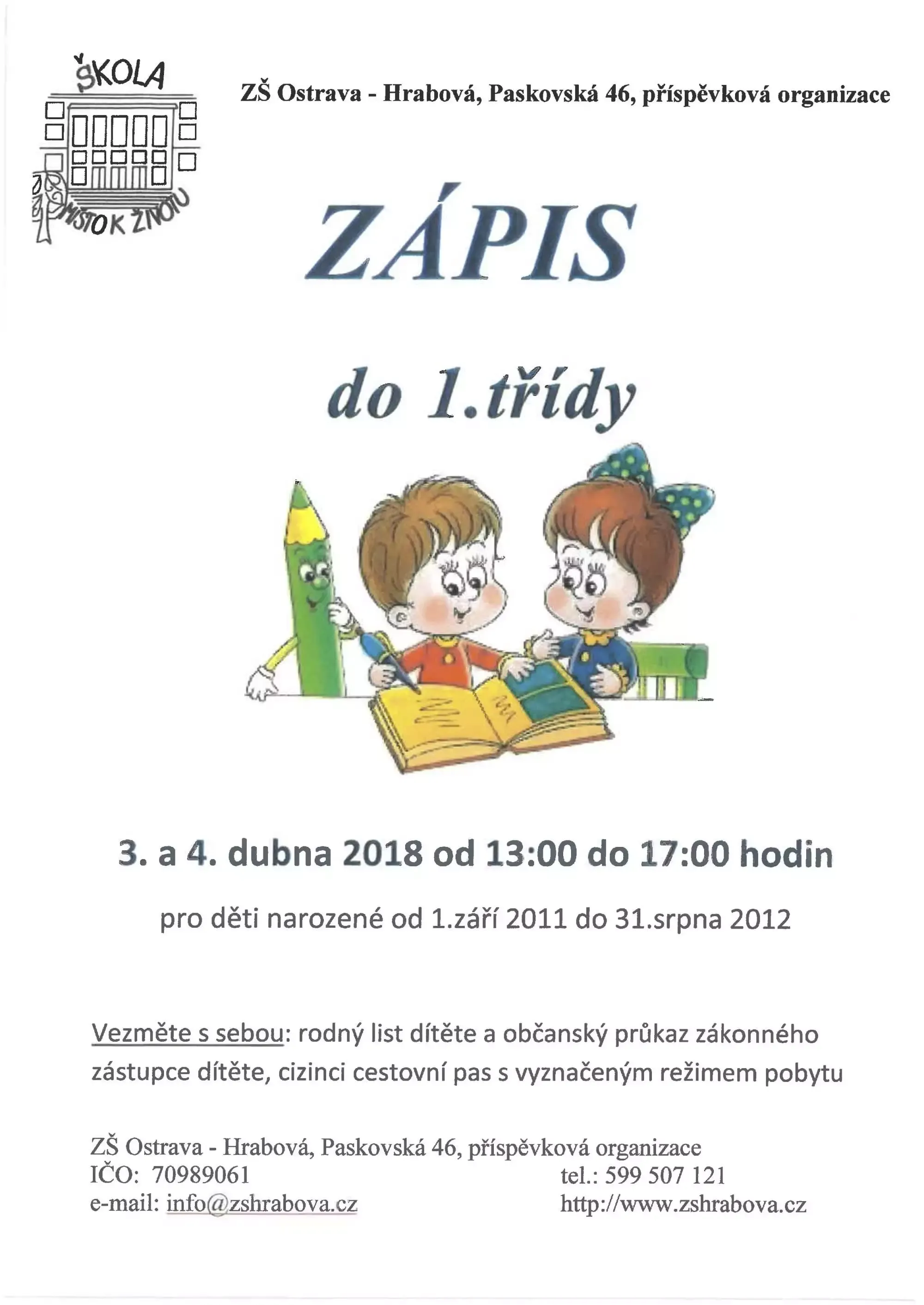 Zápis do 1. třídy se pro děti narozené od 1. září 2011 do 31. srpna 2012 koná ve dnech 3. a 4. dubna 2018 od 13:00 do 17:00 hodin.