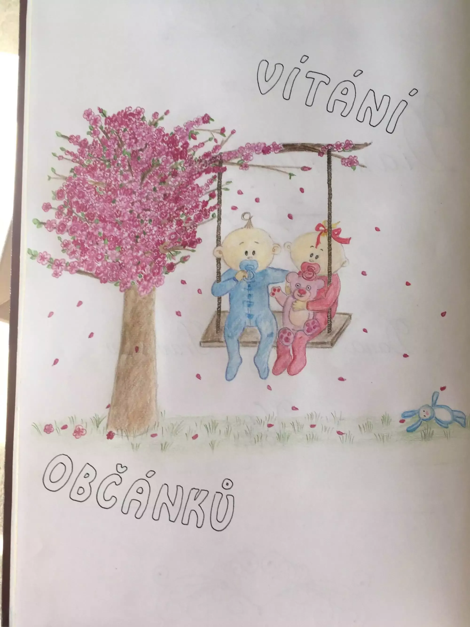 Jména občánků, zapsaná do pamětní knihy u příležitosti Vítání občánků, doprovází vždy tematicky volený obrázek s dvojčátky. Pro letošní první vítání občánků, které proběhlo 21.4.2018 a na němž se představilo veřejnosti 16 dětí, byl zvolen obrázek dětí na houpačce pod rozkvetlým stromem.