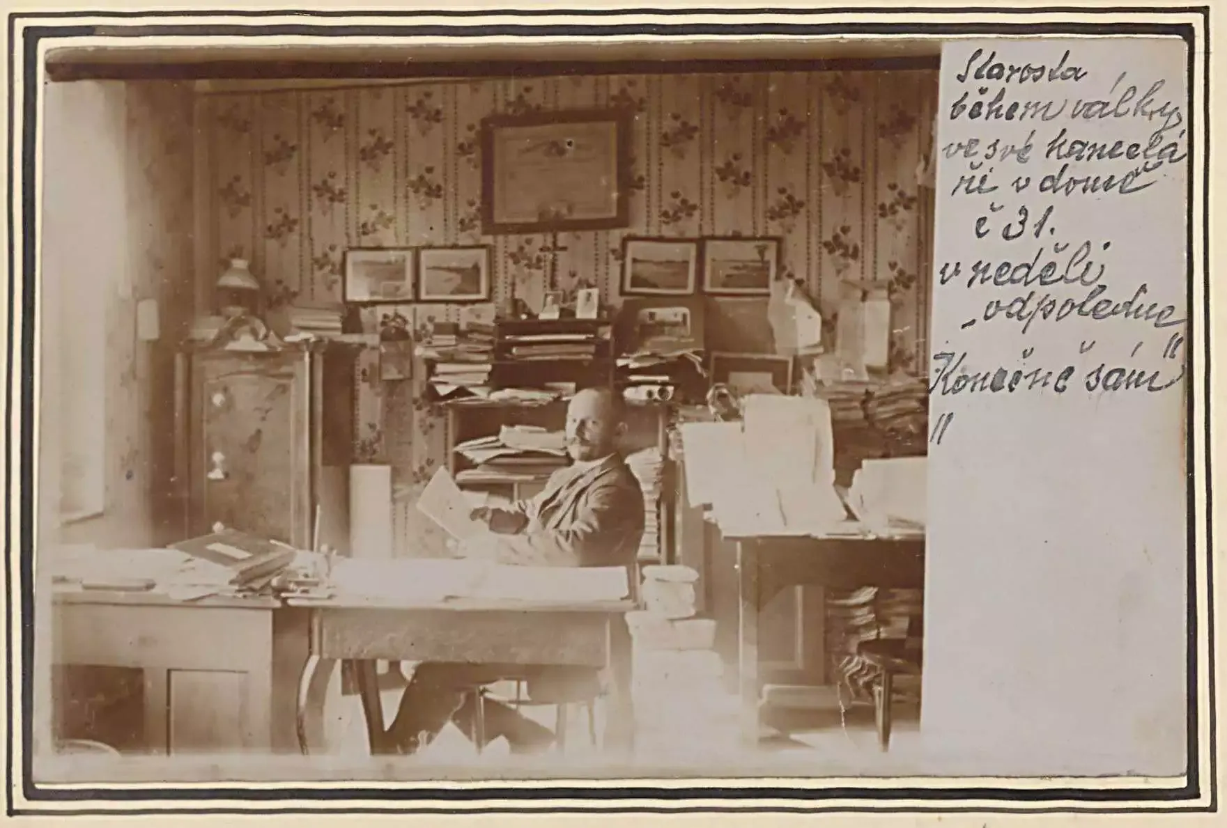 Obrázek č. 2: Starosta Adámek ve své kanceláři během války. Fotografie nese název „Konečně sám“ [292].