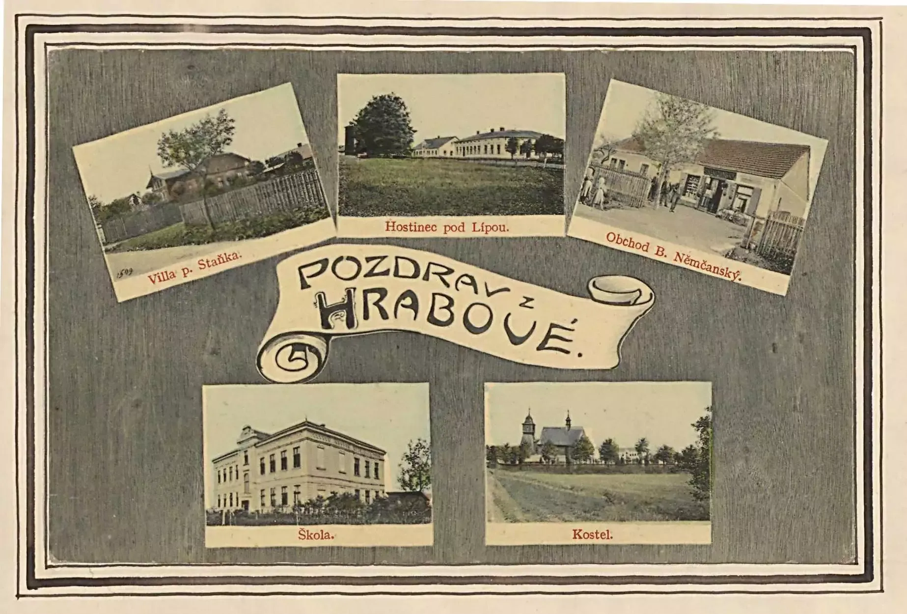 Obrázek č. 1: Na „Pozdravu z Hrabové“ je zachycena budova školy, dům Ludvíka Staňka (někdejšího starosty), jeden z obchodů se smíšeným zbožím, hostinec „Pod Lípou“ (později „U Lípy“) a kostel sv. Kateřiny. Vyobrazení pochází z doby okolo roku 1910 [291].