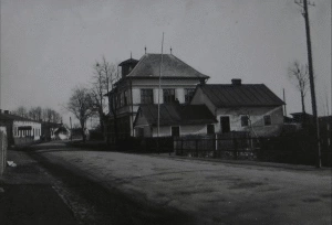 Obrázek č. 6: Paskovská, hlavní cesta procházející Hrabovou. Fotografii dominuje hasičská zbrojnice, dál vlevo je vidět hostinec „U Lípy“ [296]