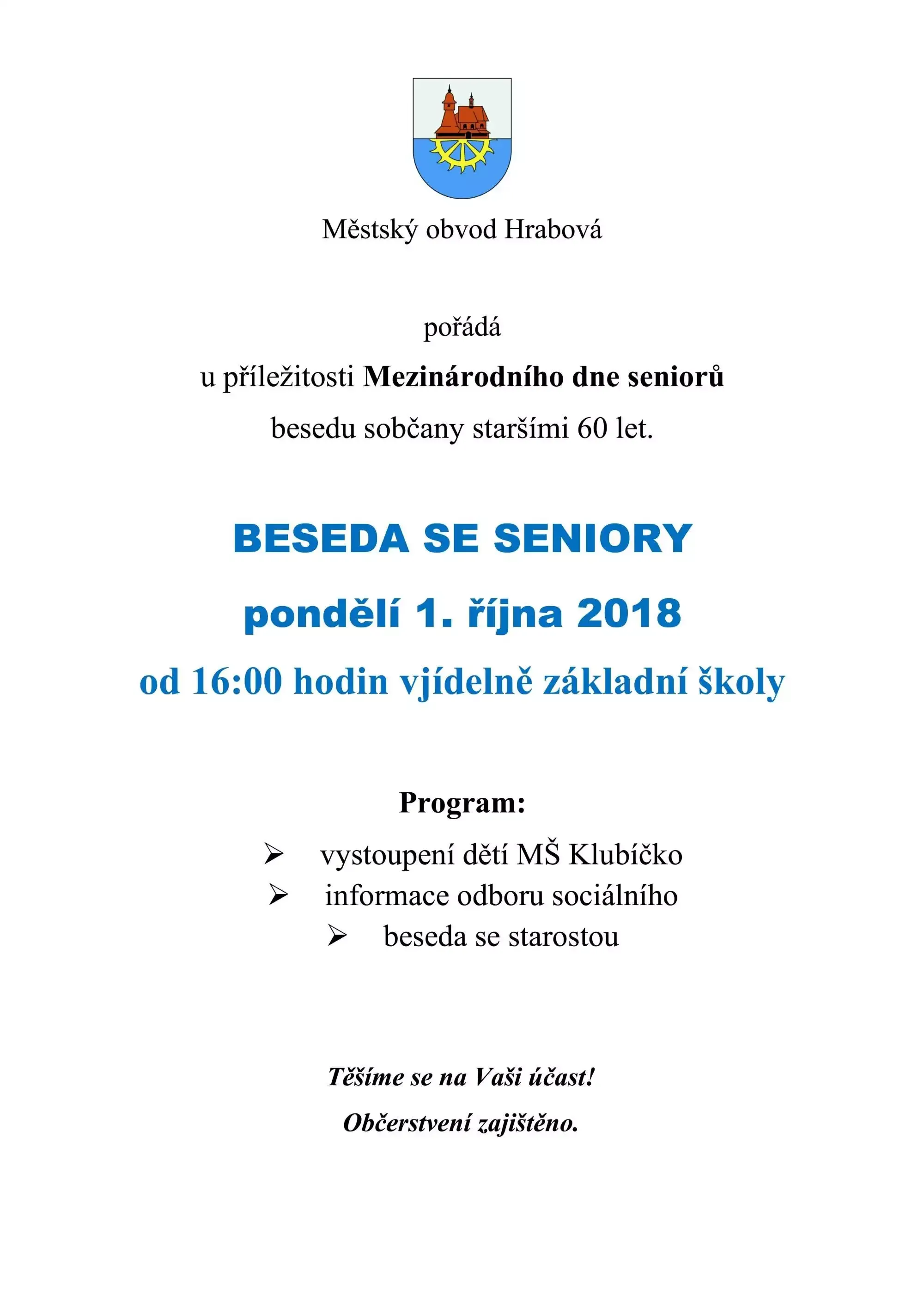 Městský obvod Hrabová pořádá u příležitosti Mezinárodního dne seniorů besedu s občany staršími 60 let. Akce se koná v pondělí 1. října 2018 od 16:00 hodin v jídelně základní školy.