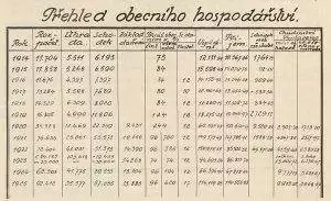 Celkem činilo 9.431’88 K. Jednotlivě obnášely: pozemková 2.942’37, činžovní 2.648’34, domovní daň třídní 896’60, výdělková 645, z důchodu 89’40, ze služného 854’04, různé 6,?-135013.