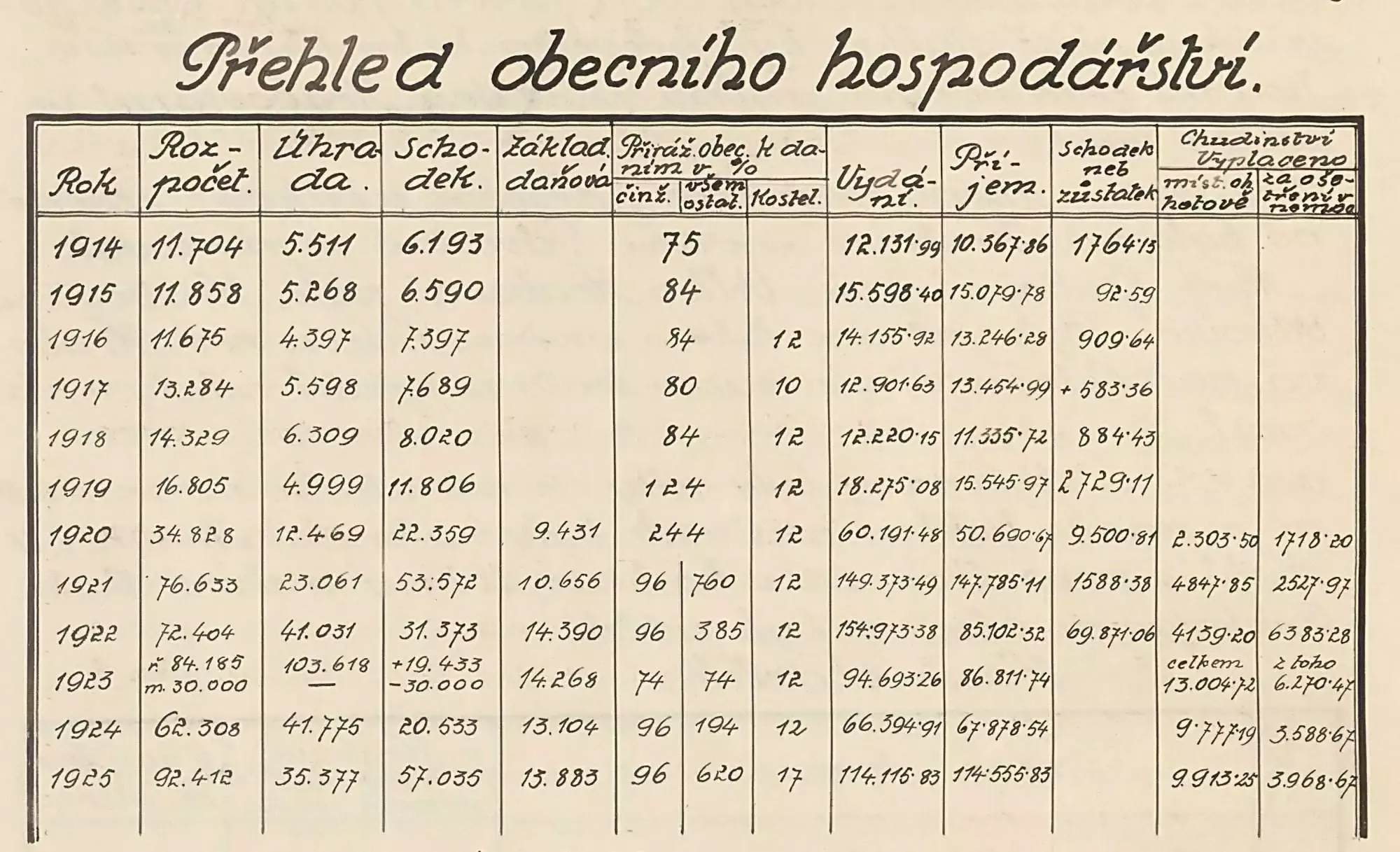 - [13.12.1925] Pro rok 1924 činil kostelní rozpočet 1472 Kč, pro rok 1925 – 1665 Kč. Usneslo se obecní zastupitelstvo 17 proti 9 hlasům, aby byl berní úřad požádán, by kostelní přírážky nebyly předpisovány všem občanům jako se dělo dosud, nýbrž jen příslušníkům církve římsko-katolické.
