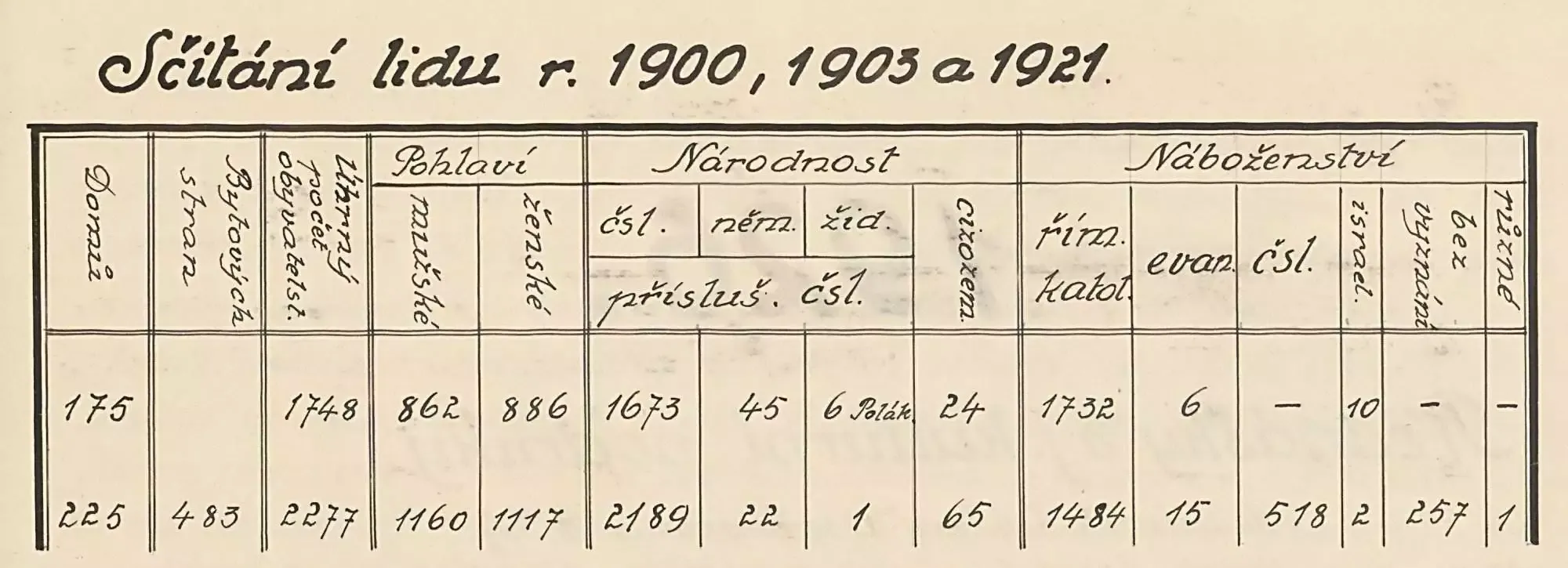 V roku 1903 přímá daň činila 9.019’21 Kč; plocha obce 997.5527 ha, z toho stavební 10.5086 ha, zdaněná 922.575 ha; počet držitelů pozemků 179; čistý výnos půdy dle katastru: 18.906’02 K; dle rozpočtu na r. 1902: obecní příjmy 988’90 K, vydání 2943’22 K; přirážky 40%; škola obecná 5ti třídní s 291 dítkami; roku 1900 umělo čísti a psáti mužů 676, žen 673; jen čísti: mužů 12, žen 54; neumělo ani čísti ani psáti mužů 174, žen 195, t.j. 21.1% obyvatel. V roce 1903 se narodilo dětí 76, zemřelo 53; sňatků uzavřeno 26. V roce 1904 bylo v obci 5 hostinců a 4 spolky.
