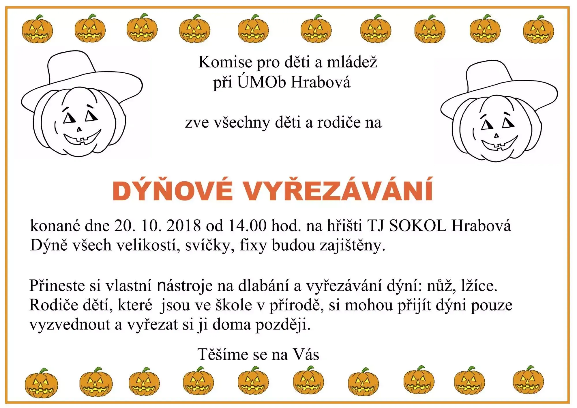 Komise pro děti a mládež při ÚMOb Hrabová zve všechny děti a rodiče na DÝŇOVÉ VYŘEZÁVÁNÍ konané dne 20. 10. 2018 od 14.00 hod. na hřišti TJ SOKOL Hrabová.