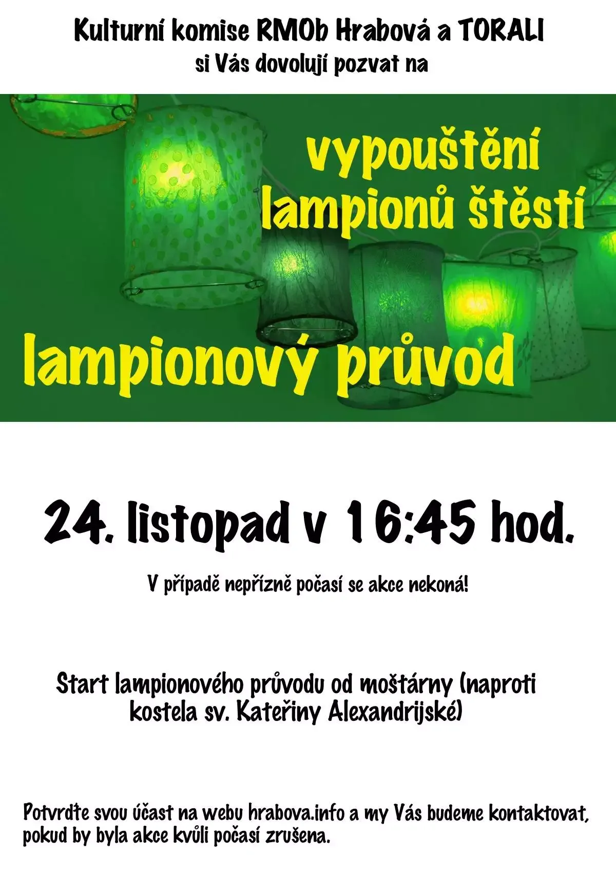 Kulturní komise RMOb Hrabová a TORALI si Vás dovolují pozvat na organizované vypouštění lampionů štěstí a lampionový průvod. Pro lampionový průvod si doneste své vlastní lampiony, komise zajišťuje pouze lampiony štěstí pro vypouštění.