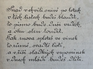 Hrozná to rána zasáhla nejen rodiny, ale i jednotu. Odcházejí mladí, svěží, pilní a nadějní soudruzi na jateční pole, aby tam prolévali pro císaře a vlast ve jménu božím, svou prolétářskou krev. Kde, že je vycházka na Radhošť? Ano 15.-16. 1914 budete mít soudruzi vycházku, ale tam daleko v Srbsku aneb v bělostné Rusi!