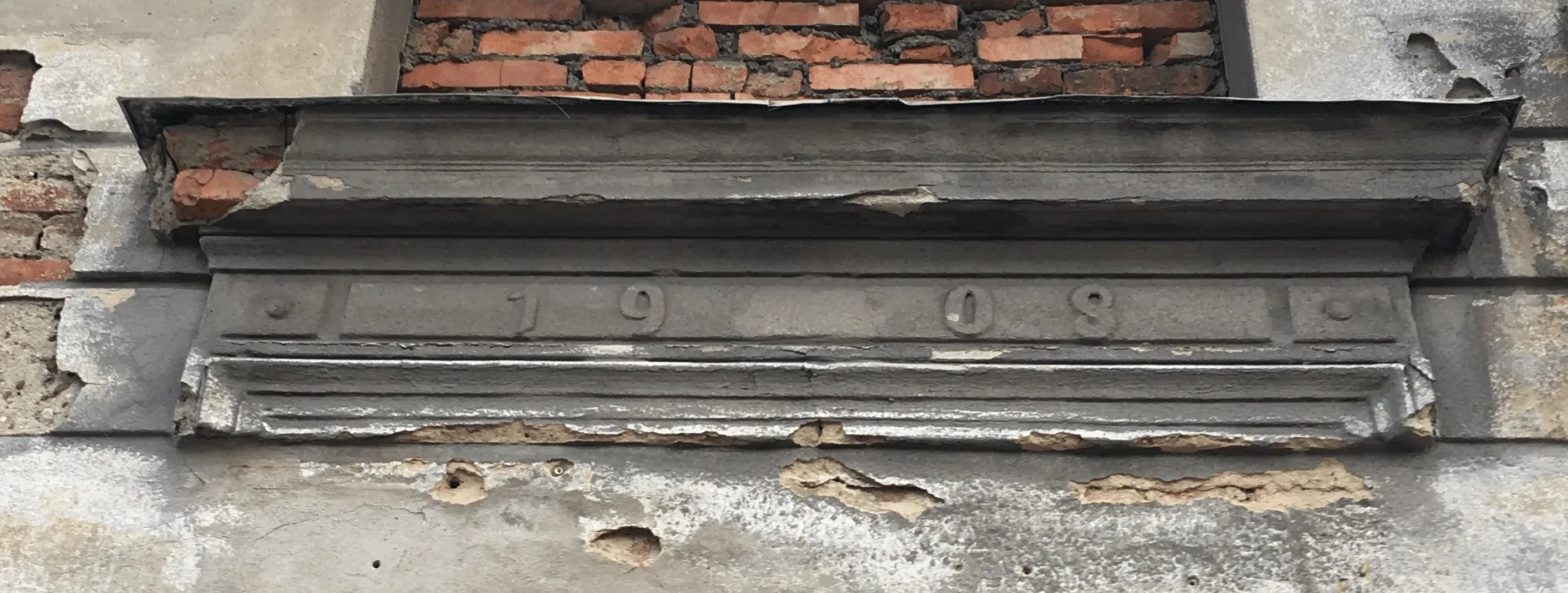 Stále ještě viditělný letopočet (1908) nad oknem vedle současných vstupních dveří
