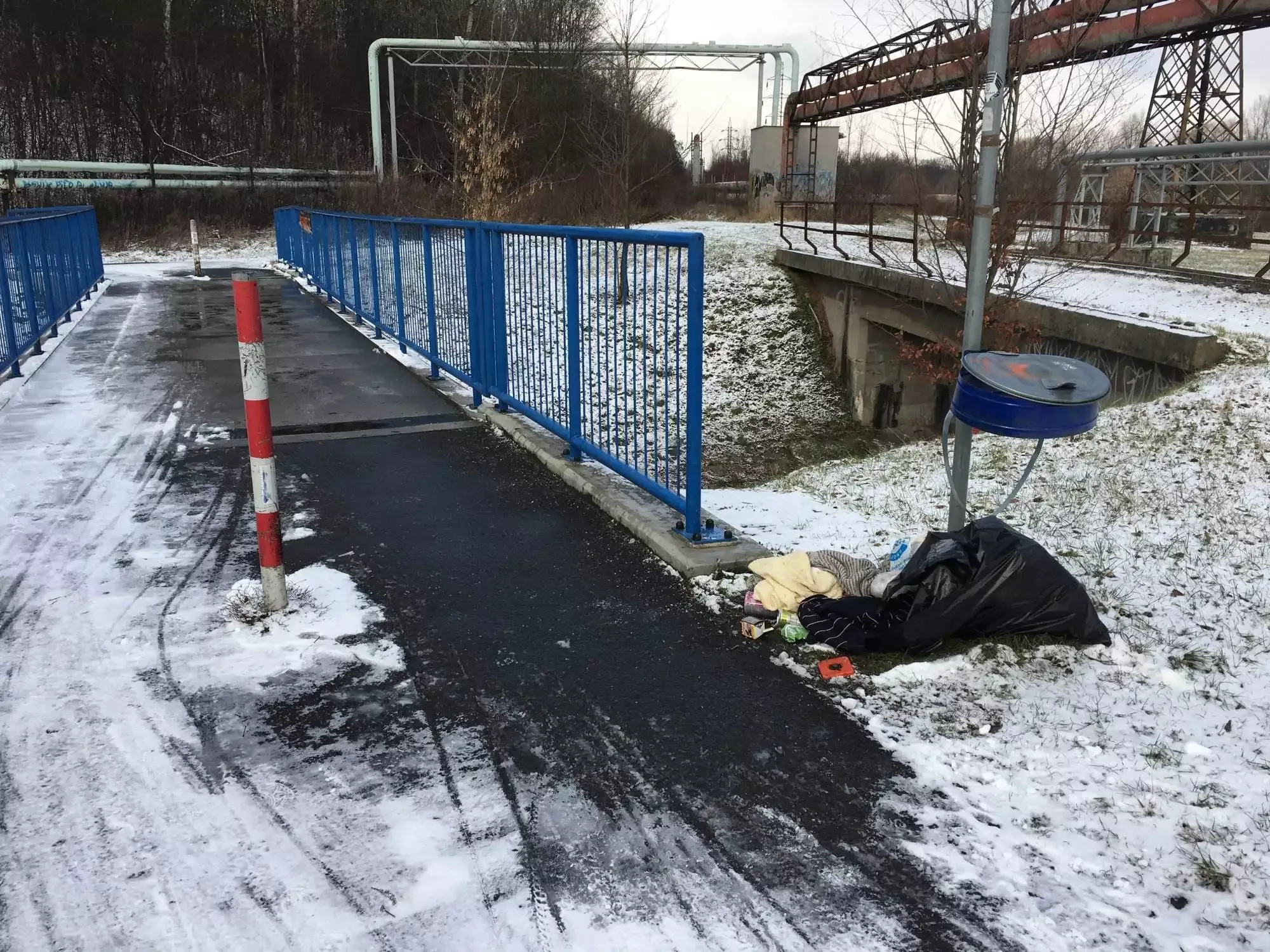Prosíme pracovníky VPP, aby odvezli pytel z odpadkového koše u mostu vedle lávky přes Ostravici. Pytel spadl z úchytu a odpadky leží rozsypané na zemi.