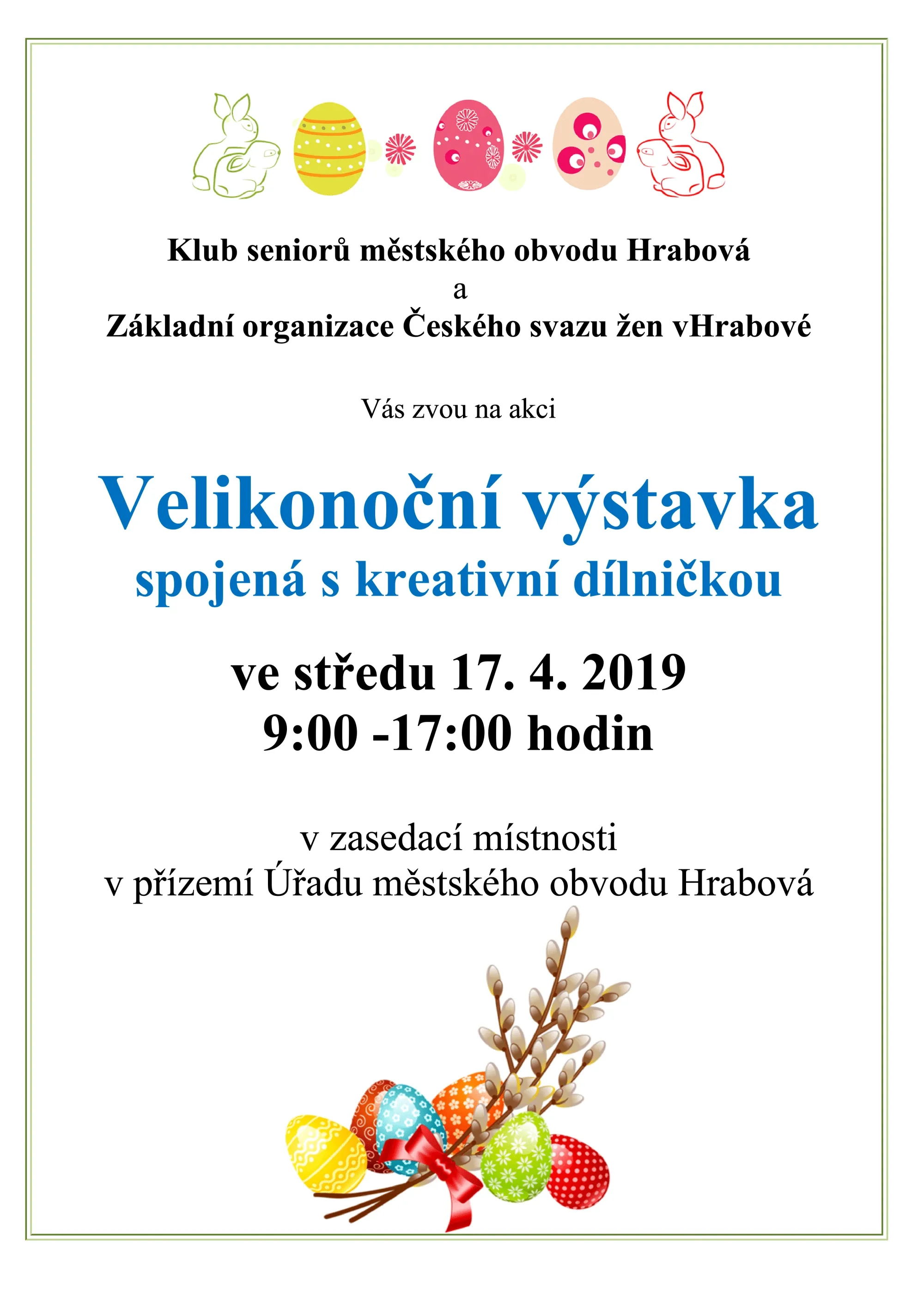 Klub seniorů městského obvodu Hrabová a Základní organizace Českého svazu žen v Hrabové Vás zvou na Velikonoční výstavku spojenou s kreativní dílničkou.