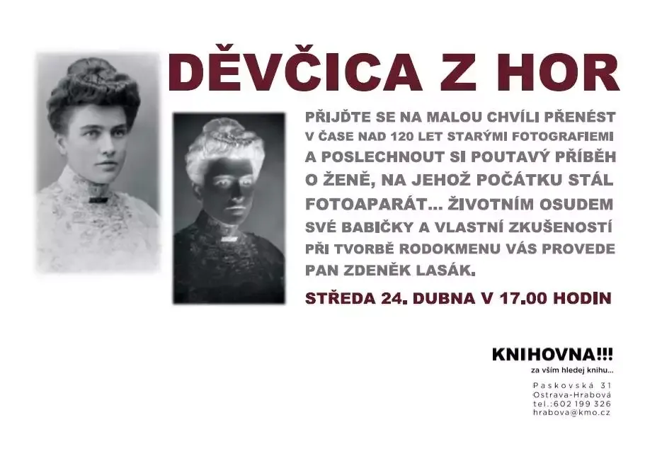 Přijďte se na malou chvíli přenést v čase nad 120 let starými fotografiemi a poslechnout si poutavý příběh o ženě, na jehož počátku stál fotoaparát… životním osudem své babičky a vlastní zkušeností při tvorbě rodokmenu Vás provede pan Zdeněk Lasák.