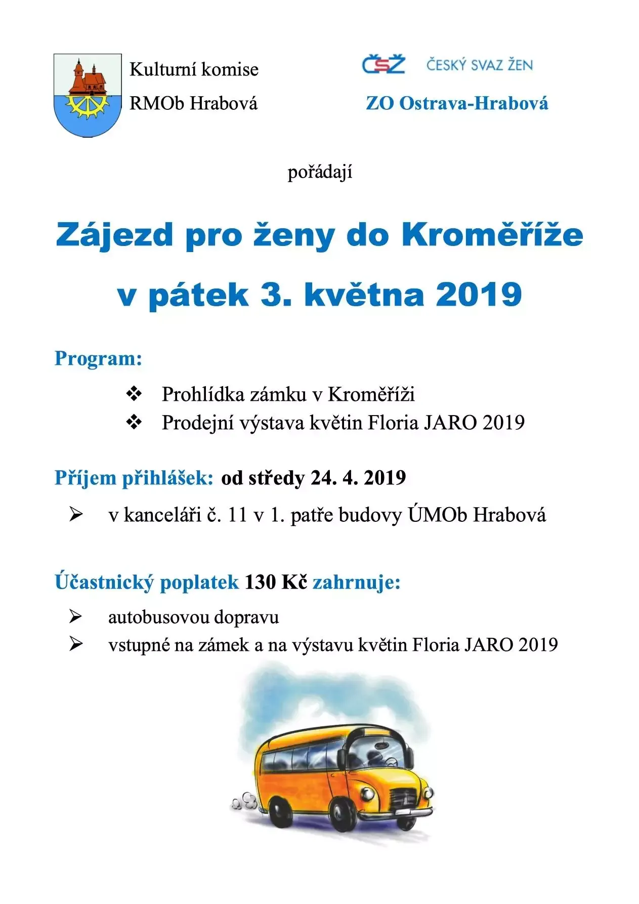 Český svaz žen ZO Ostrava-Hrabová a Kulturní komise RMOb Hrabová pořádají Zájezd pro ženy do Kroměříže v pátek 3. května 2019. Příjem přihlášek bude probíhat od středy 24. 4. 2019 v kanceláři č. 11 v 1. patře budovy ÚMOb Hrabová.