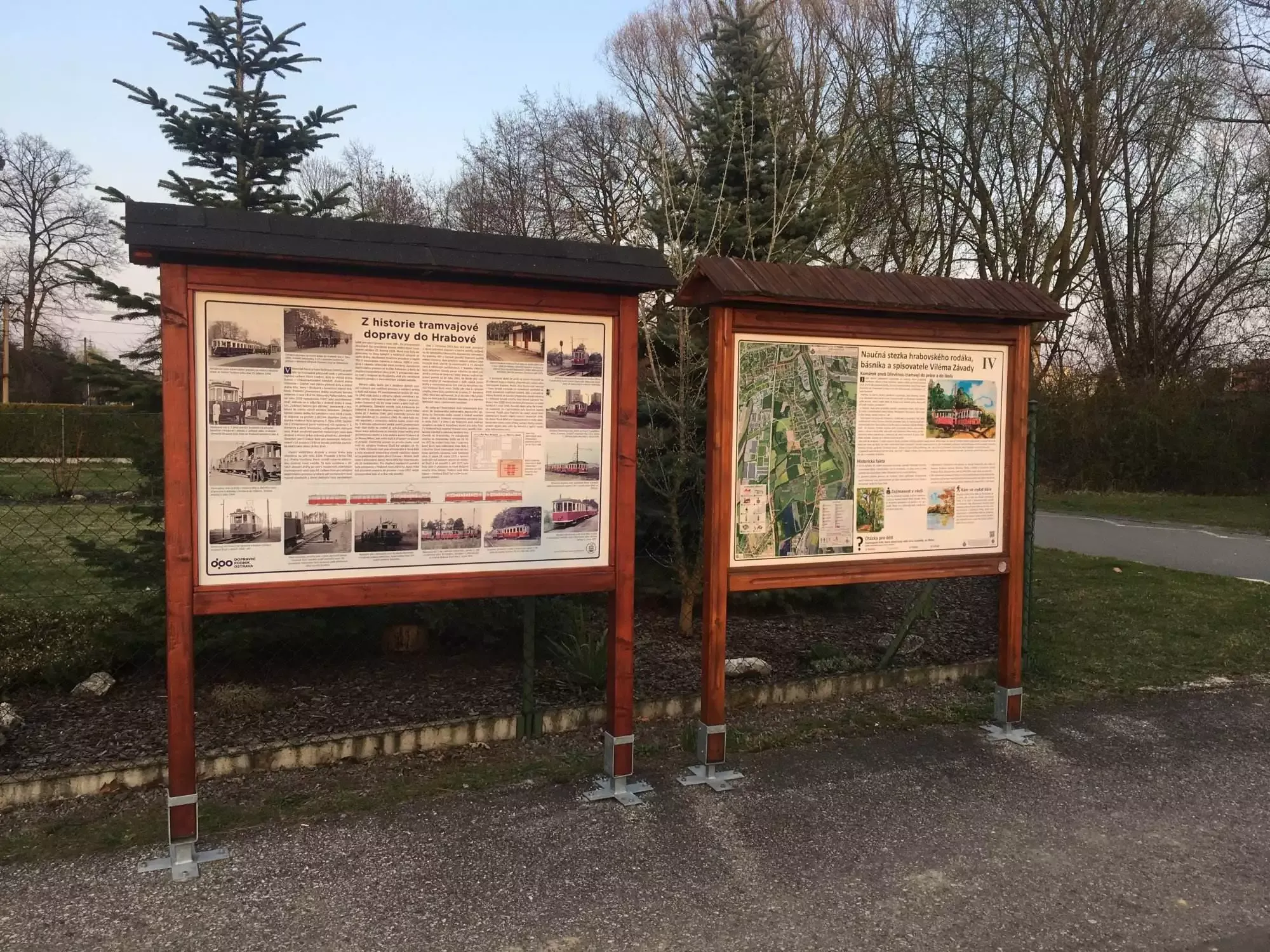 Pan Kohoutek již loni vybudoval vedle této informační tabule ještě jeden rám, do kterého byl tento měsíc nově vsazen dřevěný panel. Dnes již tedy konečně kompletní informační tabule popisuje historii tramvajové dopravy v Hrabové. Text i fotografie připravoval pečlivě dlouhé měsíce Kroužek přátel MHD a do konečné podoby vše sestavil Jiří Boháček.