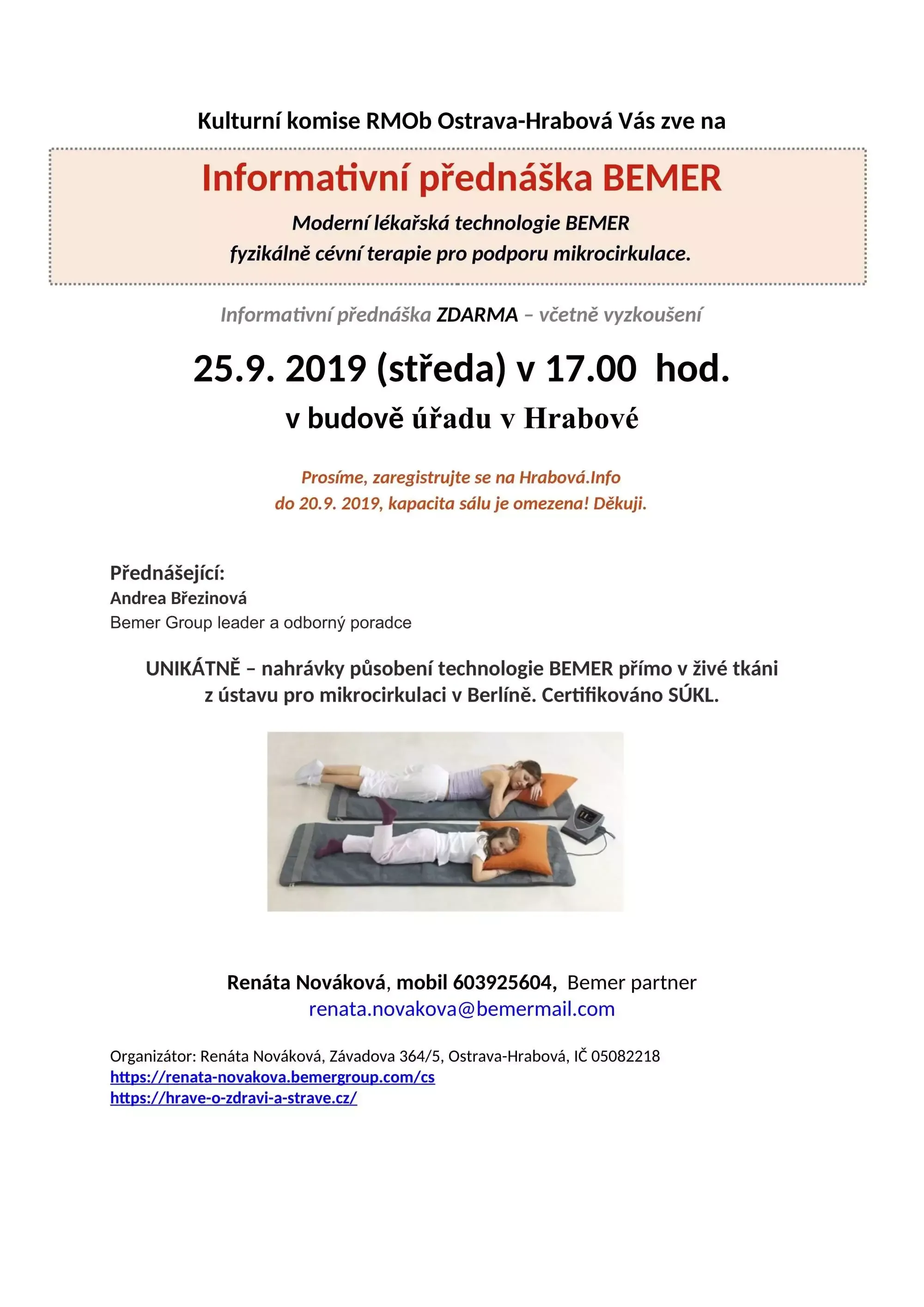 Kulturní komise RMOb Ostrava-Hrabová Vás zve na informativní přednášku Moderní lékařské technologie BEMER, fyzikálně cévní terapie pro podporu mikrocirkulace, která se uskuteční ve středu 25.9. 2019 v 17.00 hod. v budově úřadu v Hrabové.