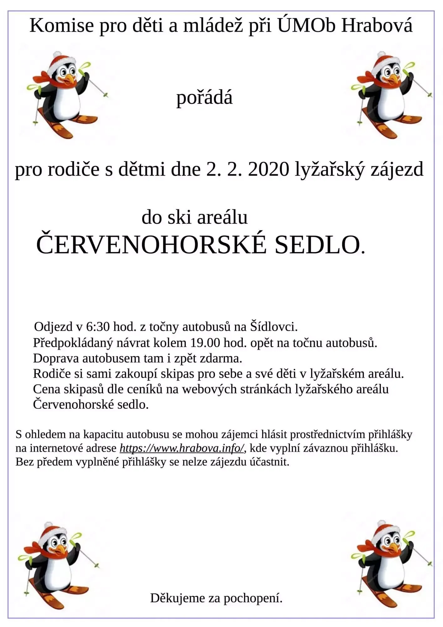 (Aktualizováno 29.1. 2020) Kapacita lyžařského zájezdu do ski areálu Červenohorské sedlo, který pořádá komise pro děti a mládež dne 2.2. 2020 byla naplněna. Omlouváme se a děkujeme za pochopení.