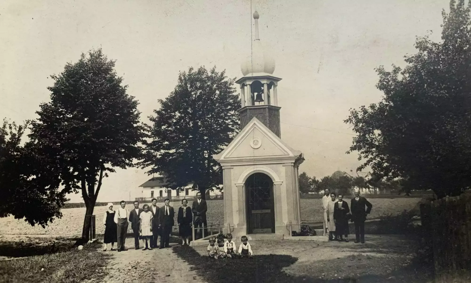 A konečně poslední zajímavostí, kterou si dovolím k níže uvedenému přepisu dodat, je historická fotografie kapličky, kterou jsem získal právě od občana F.J., kde mladá slečna zleva by mohla být jeho matkou: