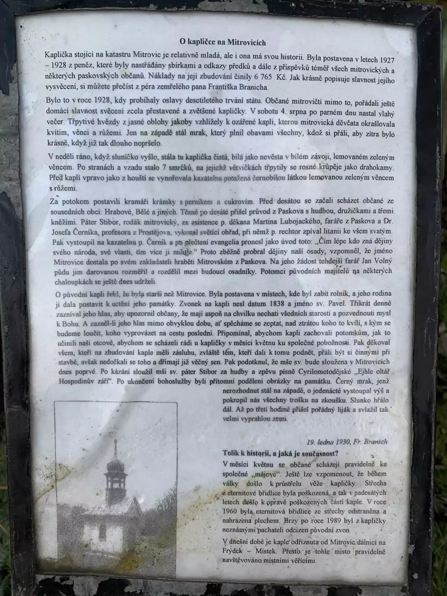 O původní kapli řekl, že byla starší než Mitrovice. Byla postavena v místech, kde byl zabit rolník, a jeho rodina ji dala postavit k uctění jeho památky. Zvonek na kapli nesl datum 1838 a jméno sv. Pavel. Třikrát denně zazníval jeho hlas, aby upozornil občany, že mají aspoň na chvilku nechati všedních starostí a pozvednouti mysl k Bohu. A zazněl-li jeho hlas mimo obvyklou dobu, ať spěcháme se zeptat, nad ztrátou koho to kvílí, s kým se budeme loučit, koho vyprovázet na cestu poslední. Připomínal, abychom kapli zachovali potomkům, jak to učinili naši otcové, abychom se scházeli rádi u kapličky v měsíci květnu ku společné pobožnosti. Pak děkoval všem, kteří na zbudování kaple měli zásluhu, zvláště těm, kteří dali k tomu podnět, přáli být si činnými při stavbě, avšak nedočkali se toho a dřímají již věčný sen. Pak podotknul, že mše sv. bude sloužena v Mitrovicích dnes poprvé. Po kázání sloužil mši sv. páter Stibor za hudby a zpěvu písně Cyrilometodějské „Ejhle oltář Hospodinův září“. Po ukončení bohoslužby byli přítomní poděleni obrázky na památku. Černý mrak, jenž nerozhodnut stál na západě, o jedenácté vystoupal výš a pokropil nás všechny trošku na zkoušku. Slunko hřálo dál. Až po třetí hodině přišel pořádný liják a svlažil tak velmi vyprahlou zemi.