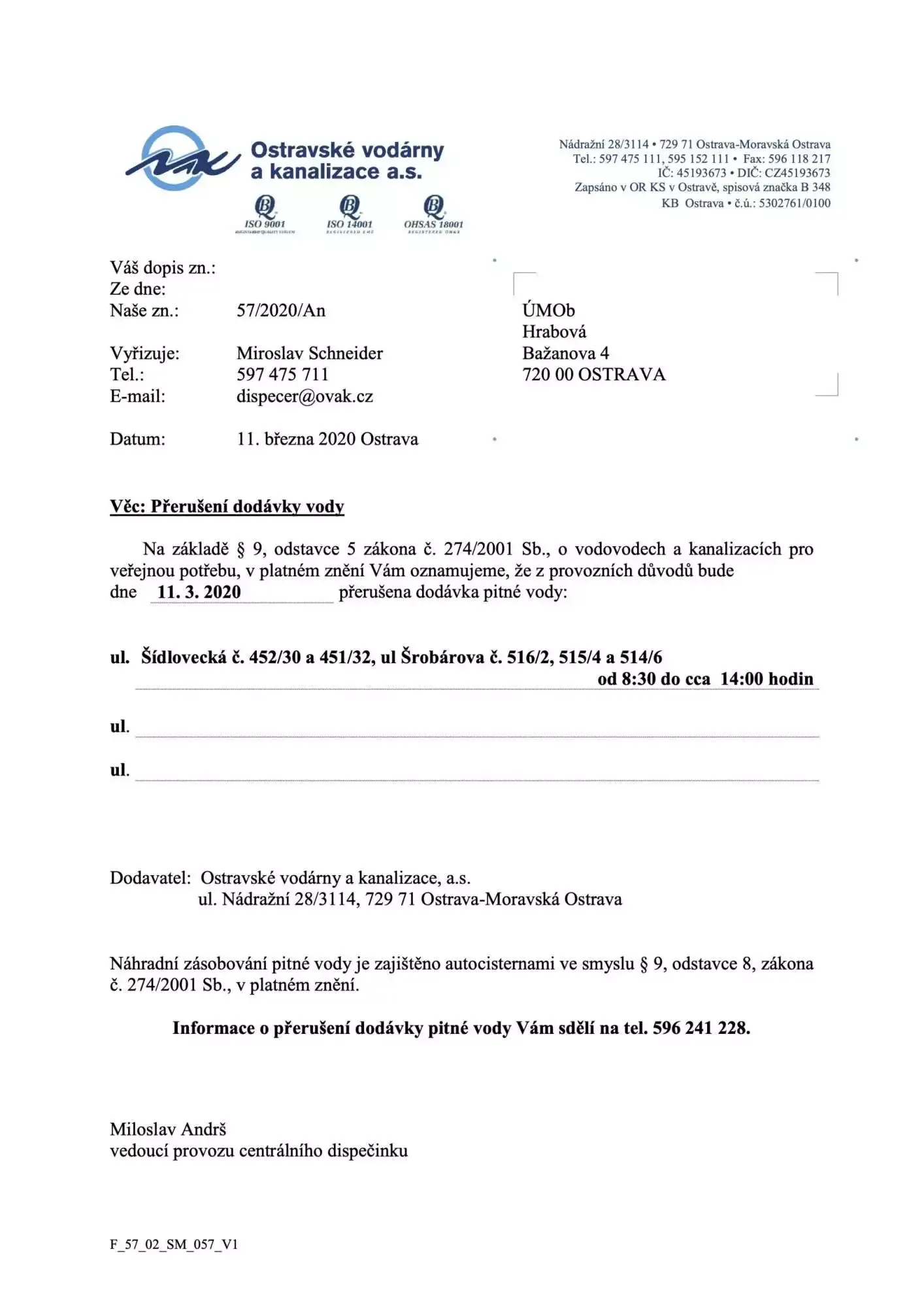 SMSInfoKanál Hrabové: Ostravské vodárny a kanalizace oznamují, že dnes 11.3. 2020 bude z provozních důvodů přerušena dodávka pitné vody. Týká se to ul. Šídlovecká č. 452/30 a 451/32 a ul. Šrobárova č. 516/2, 515/4 a 514/6.