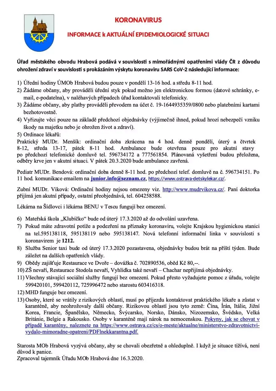 Úřad mÄ›stskĂ©ho obvodu Hrabová podává v souvislosti s mimořádnĂ˝mi opatĹ™enĂmi vlády ÄŚR z dĹŻvodu ohroĹľenĂ zdravĂ v souvislosti s prokázánĂm vĂ˝skytu koronaviru SARS CoV-2 následujĂcĂ informace:
