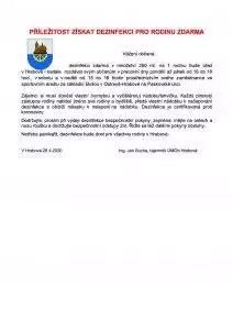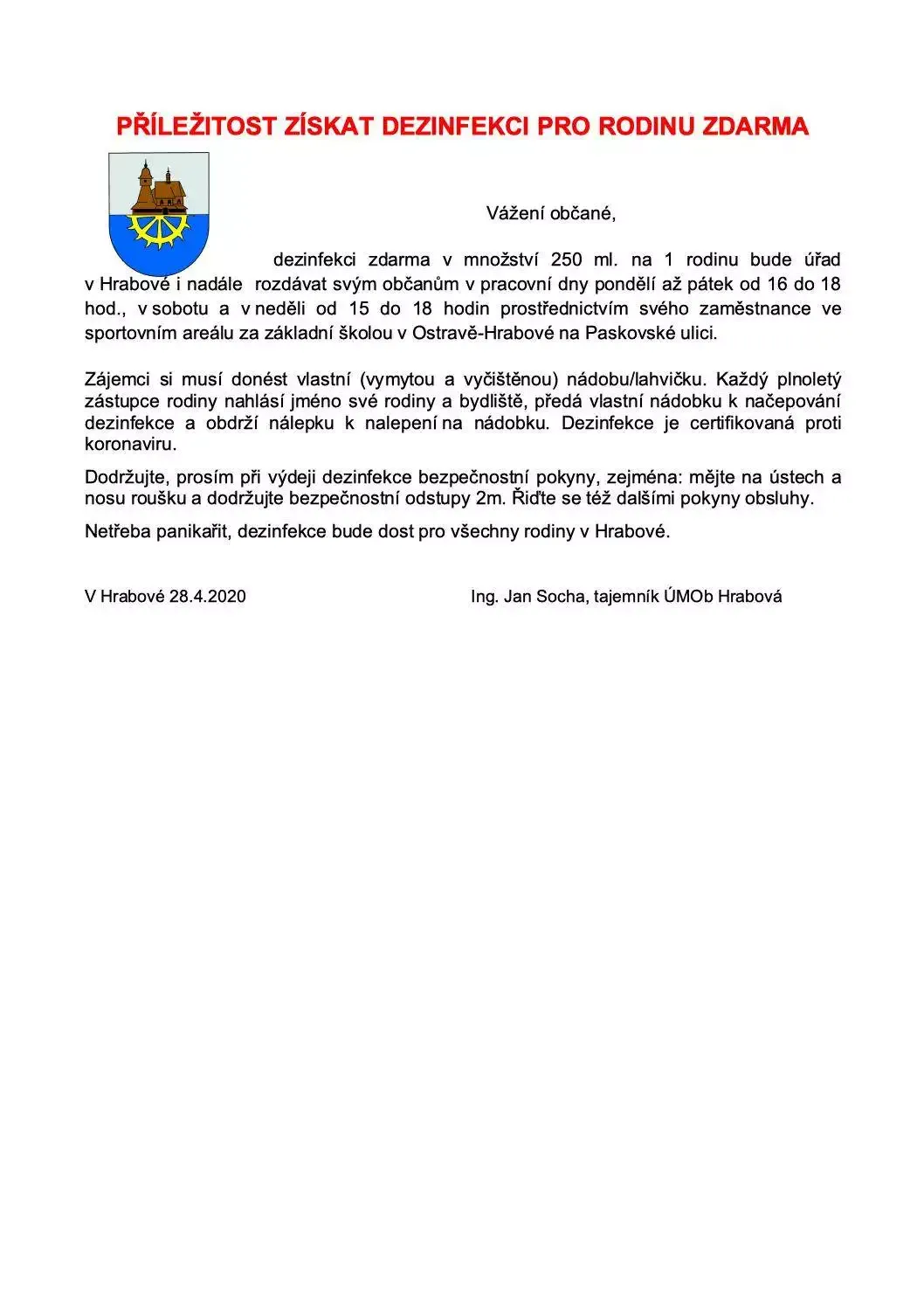 Dezinfekci zdarma v množství 250 ml. na 1 rodinu bude úřad v Hrabové i nadále rozdávat svým občanům v pracovní dny pondělí až pátek od 16 do 18 hod., v sobotu a v neděli od 15 do 18 hodin prostřednictvím svého zaměstnance ve sportovním areálu za základní školou v Ostravě-Hrabové na Paskovské ulici.
