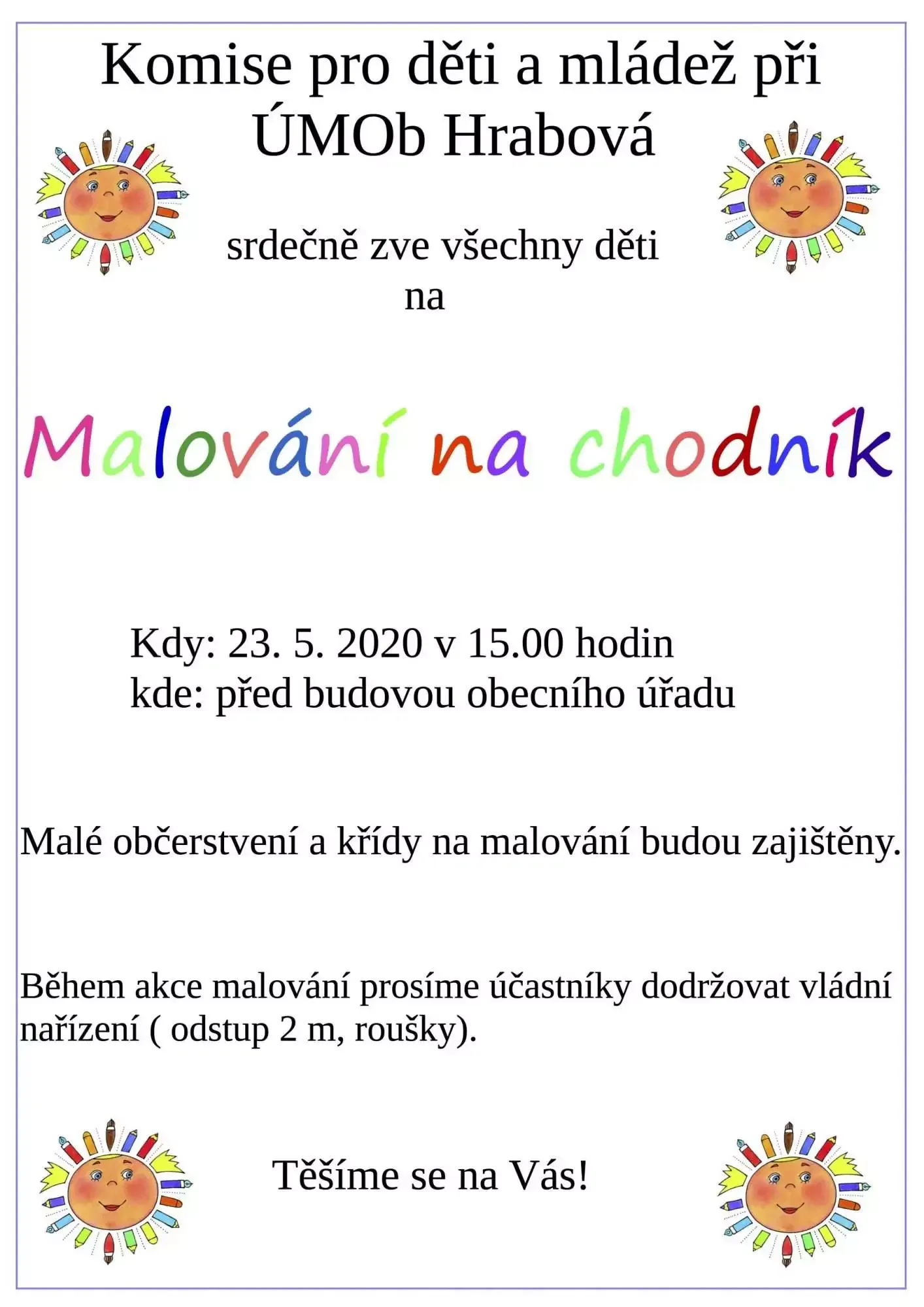 Komise pro děti a mládež RMOb Hrabová srdečně zve všechny děti na tradiční hrabovskou akci Malování na chodník, která se uskuteční před budovou úřadu v Ostravě-Hrabové dne 23.5. 2020 v 15 hod.