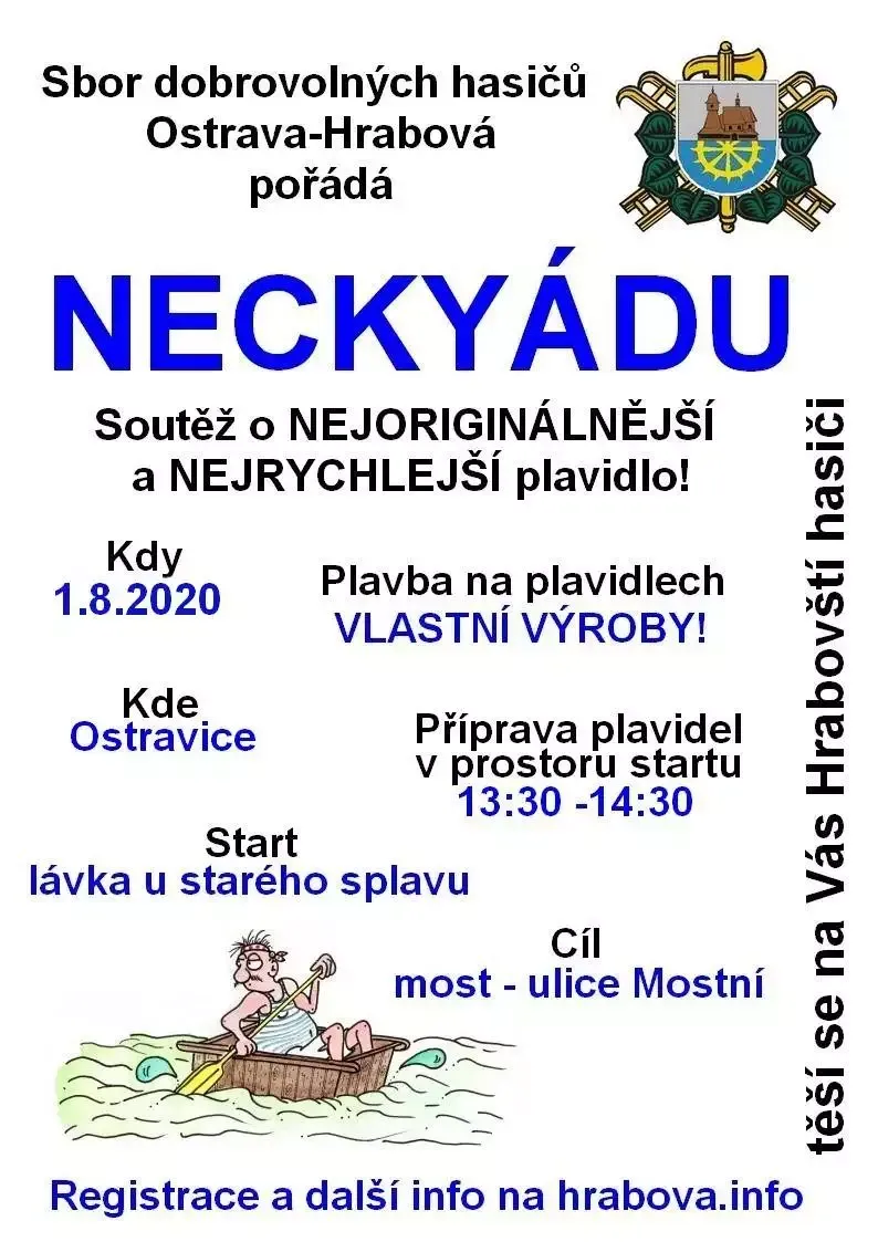 Členové Sboru dobrovolných hasičů Hrabová vás zvou na obnovenou tradiční Neckyádu, která se uskuteční v Ostravě-Hrabové na řece Ostravici dne 1. srpna 2020 v odpoledních hodinách.