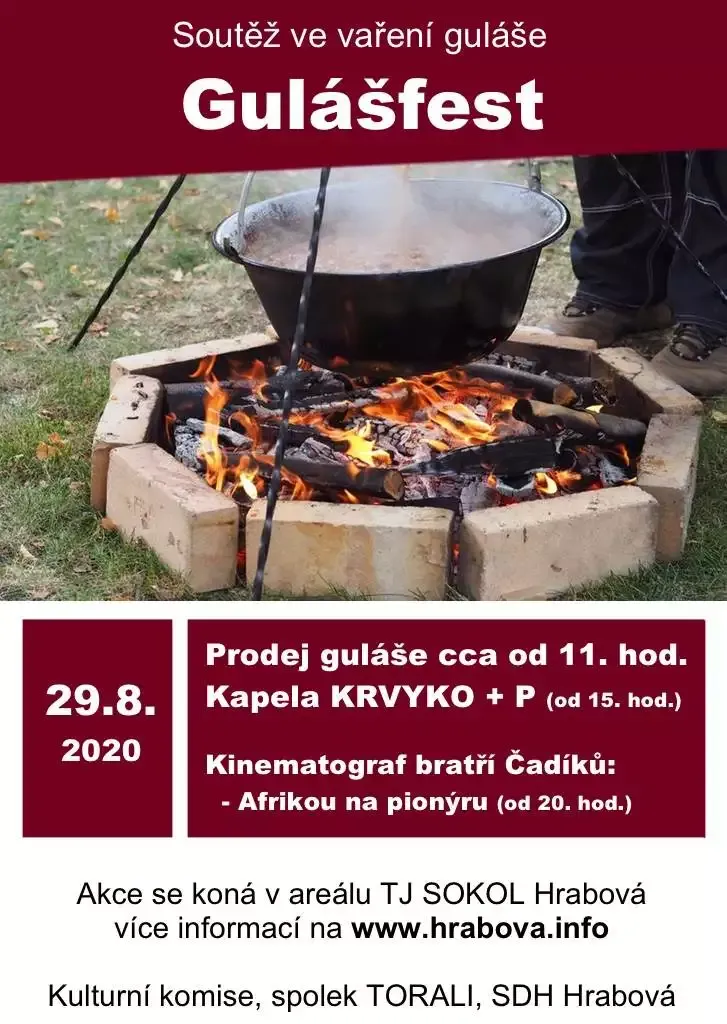 Zveme Vás na třetí ročník Hrabovského gulášfestu – soutěž ve vaření guláše o putovní pohár. Akce se koná dne 29. srpna 2020 v areálu TJ SOKOL Hrabová.