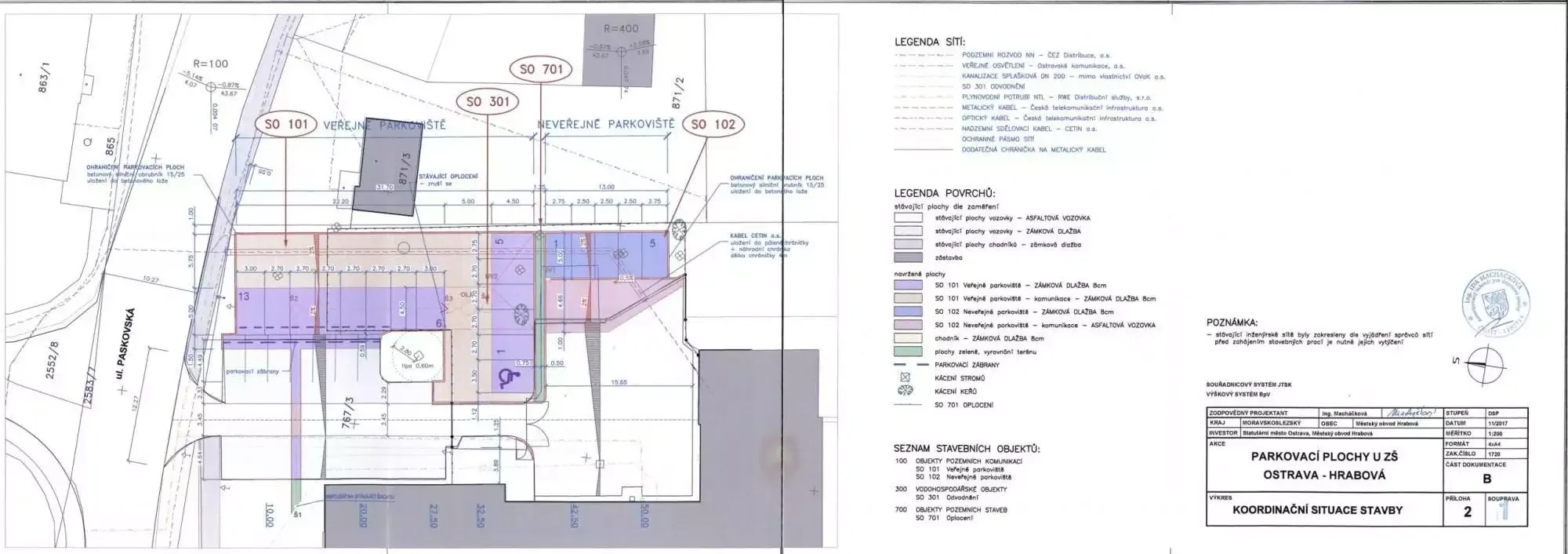 Jedná se o rozšíření stávajícího veřejného parkoviště u základní školy o 14 kolmých parkovacích stání, z toho jedno stání bude vyhrazeno pro vozidlo přepravující osobu těžce pohybově postiženou (dále jen „ZTP“). Parkoviště bude rozšířeno směrem k pozemku parc. č. 871/2 v k.ú. Hrabová. Rozšířená část bude napojena novou komunikací na stávající příjezdovou komunikaci, která je napojena na ul. Paskovskou. Stávající příjezd na parkoviště z ul. Paskovské zůstane nezměněn. Šířka parkovacích stání bude 2,7 m, krajní stání budou mít šířku 3 m a 2,75 m. Šířka stání pro ZTP bude 3,5 m. Délka parkovacích stání bude 4,5 m s možností převisu a 5 m bez možnosti převisu. Parkovací stání budou mít povrch ze zámkové dlažby tl.